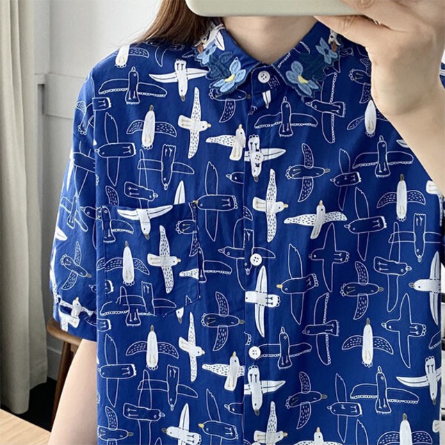 大人気のバードプリント襟刺繍ブラウスの 半袖バージョン登場 【素材・成分】 コットン サイズ 身幅56 着丈65 ブラック新登場