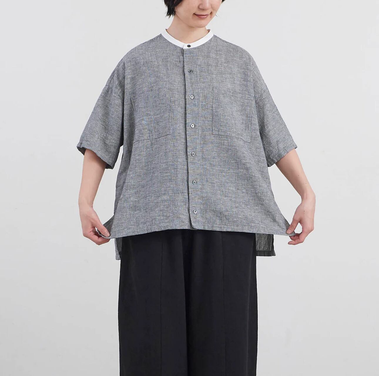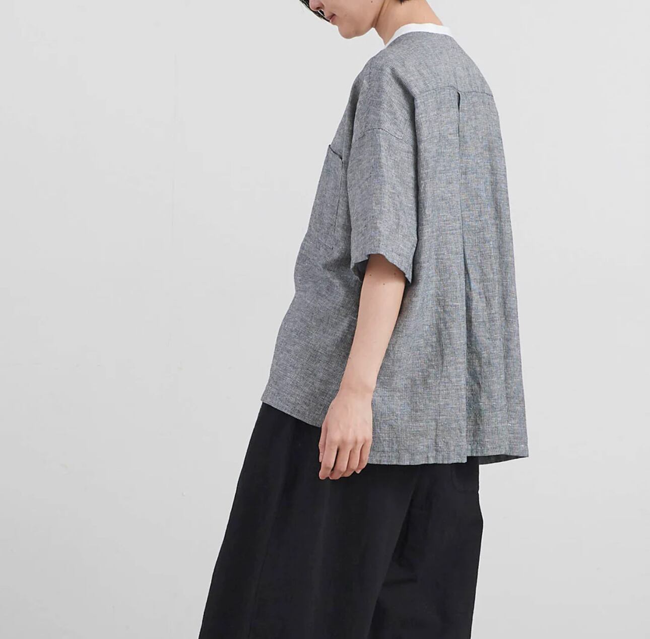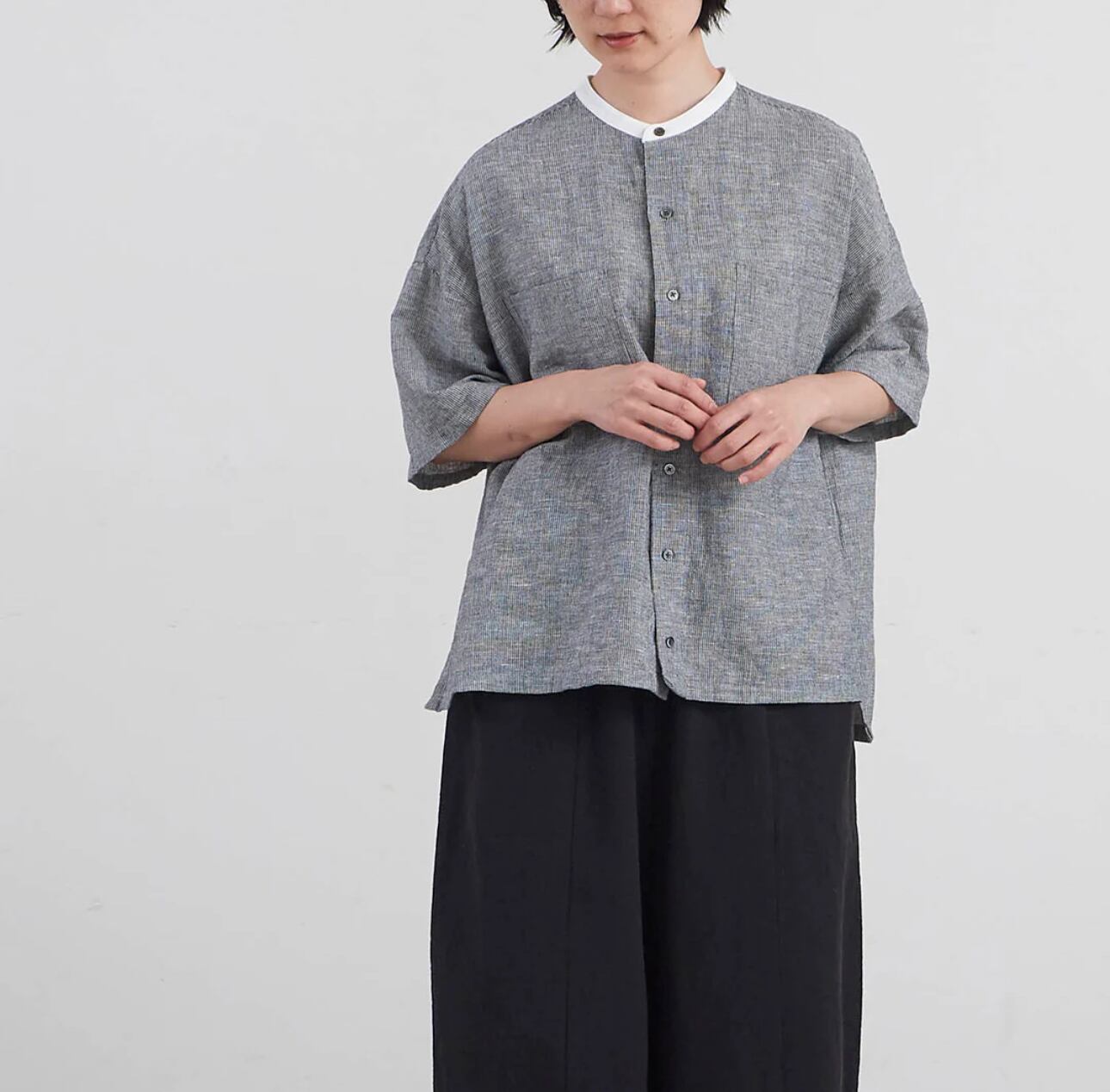 清涼感があり、透け感の少ない綿麻ストライプ生地。肘が隠れる袖丈で安心感があります。両胸ポケット、クレリックの襟がアクセントになります。ボックスシルエットでメンズライクにもコーディネートできます。
