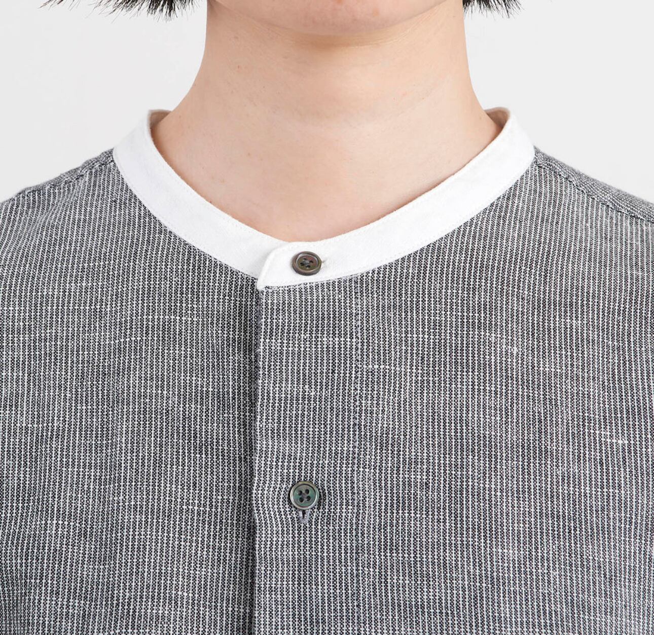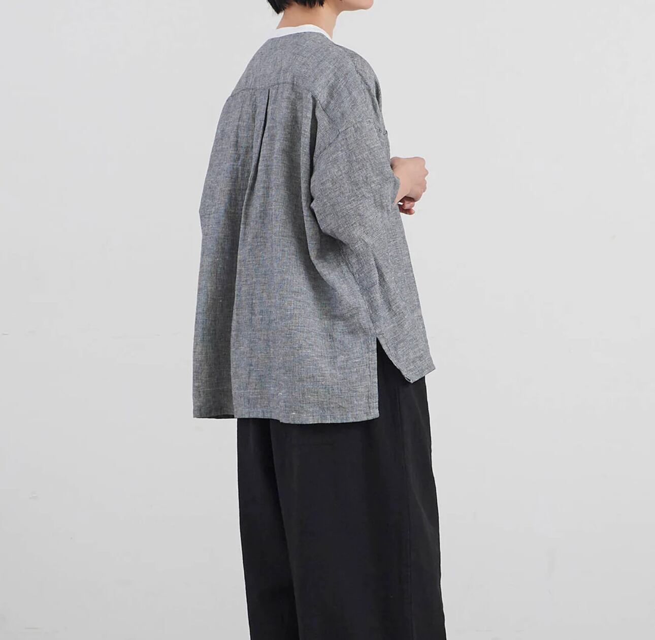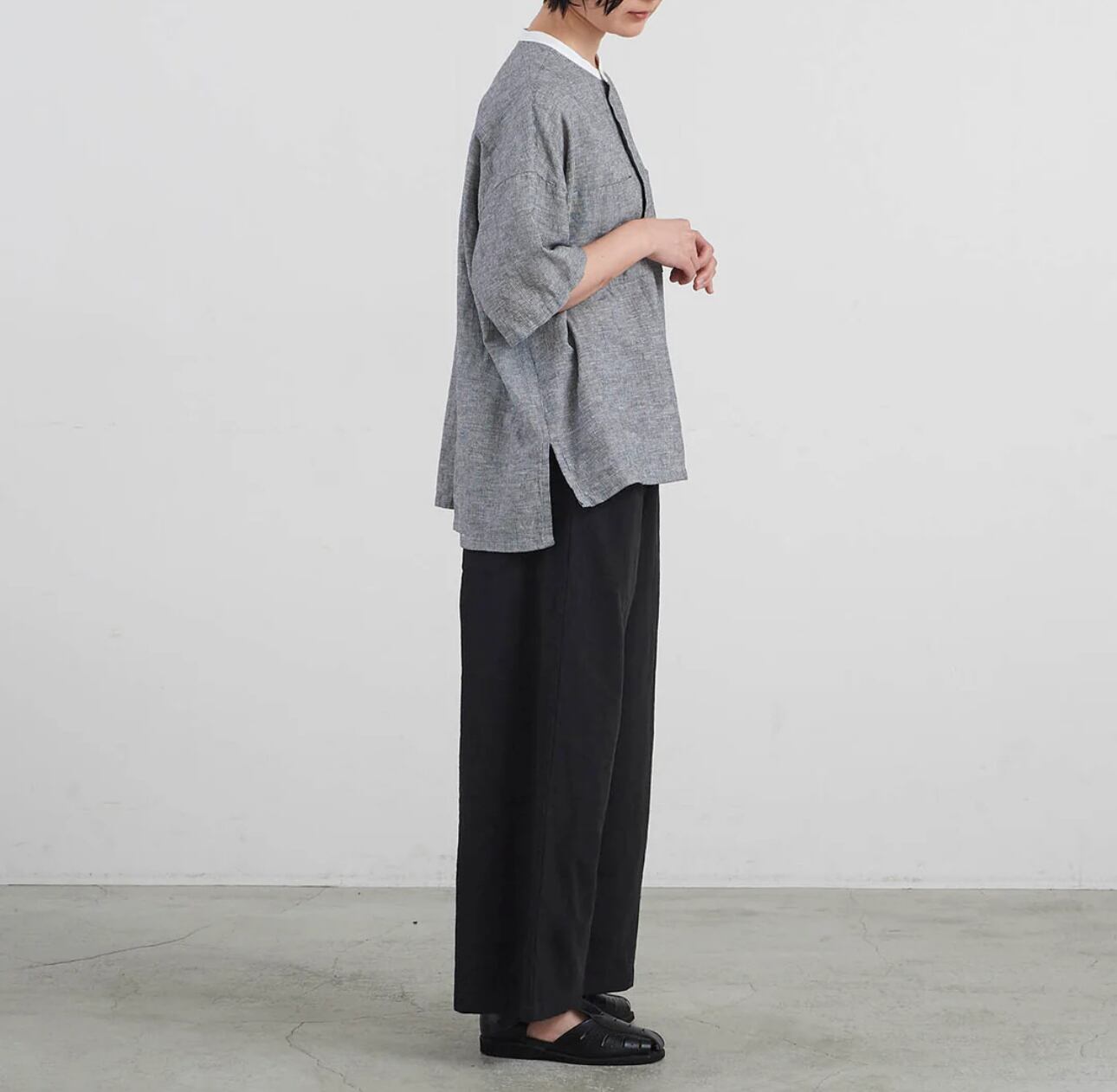 清涼感があり、透け感の少ない綿麻ストライプ生地。肘が隠れる袖丈で安心感があります。両胸ポケット、クレリックの襟がアクセントになります。ボックスシルエットでメンズライクにもコーディネートできます。