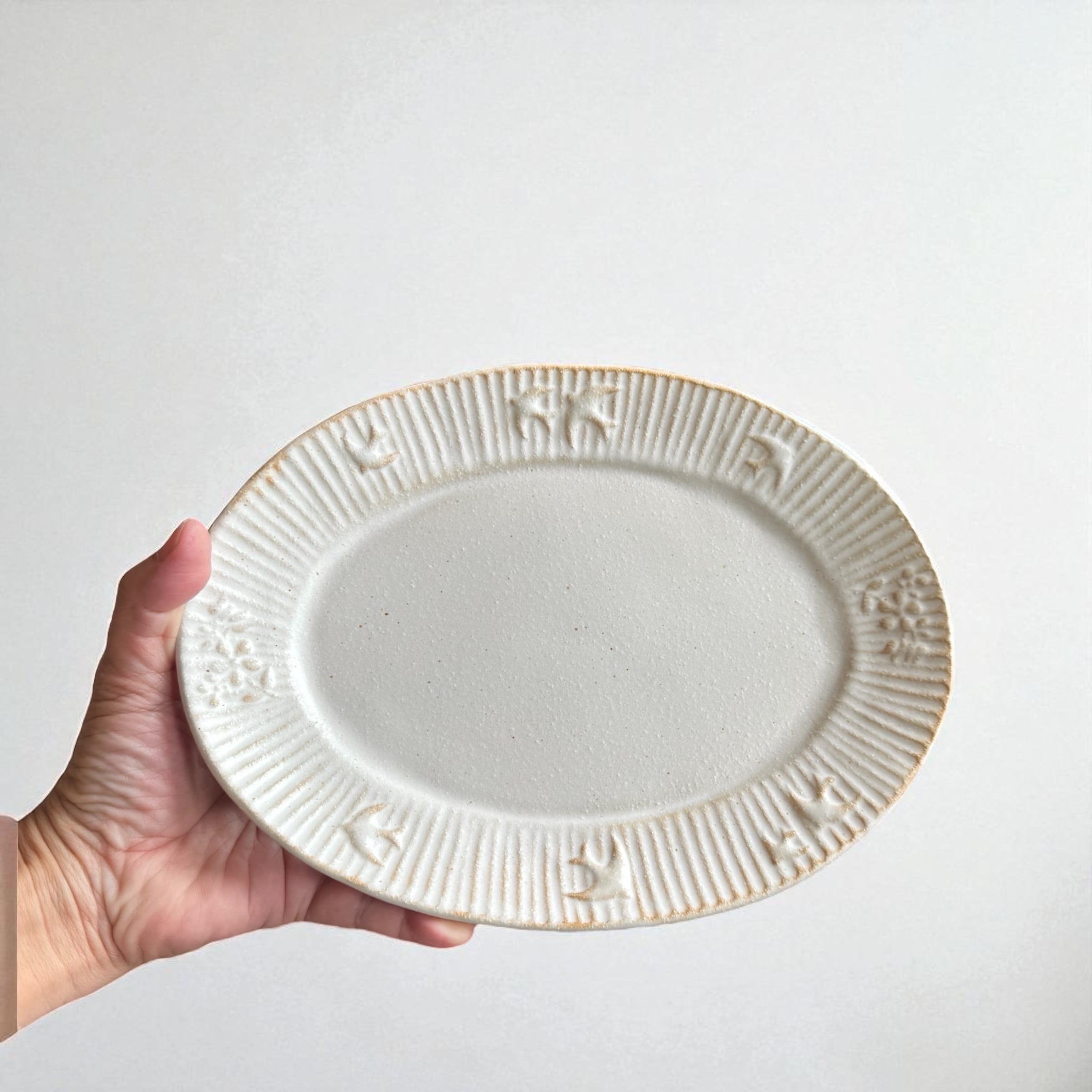 かわいい小鳥のレリーフ模様をあしらった、益子焼の楕円皿です。 幅25×18cm前後 / 高さ2cm前後 【素材・成分】 陶器(益子焼) 【生産地】 日本 注意事項 電子レンジ・食洗器 対応 オーブン・直火 不可 ※形状や色合い(釉薬の濃淡、色ムラ)には個体差がございます。 ※うつわ表面にピンホール(小さな陥没)・小さな突起・釉薬のたれた跡などがみられることがございます。