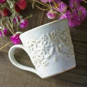ぽってりしたお花のレリーフ模様がかわいい、北欧風のマグカップです。ベーシックで使いやすい形状と、温かみのある風合いが魅力。