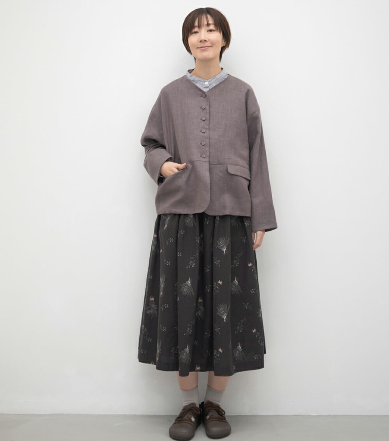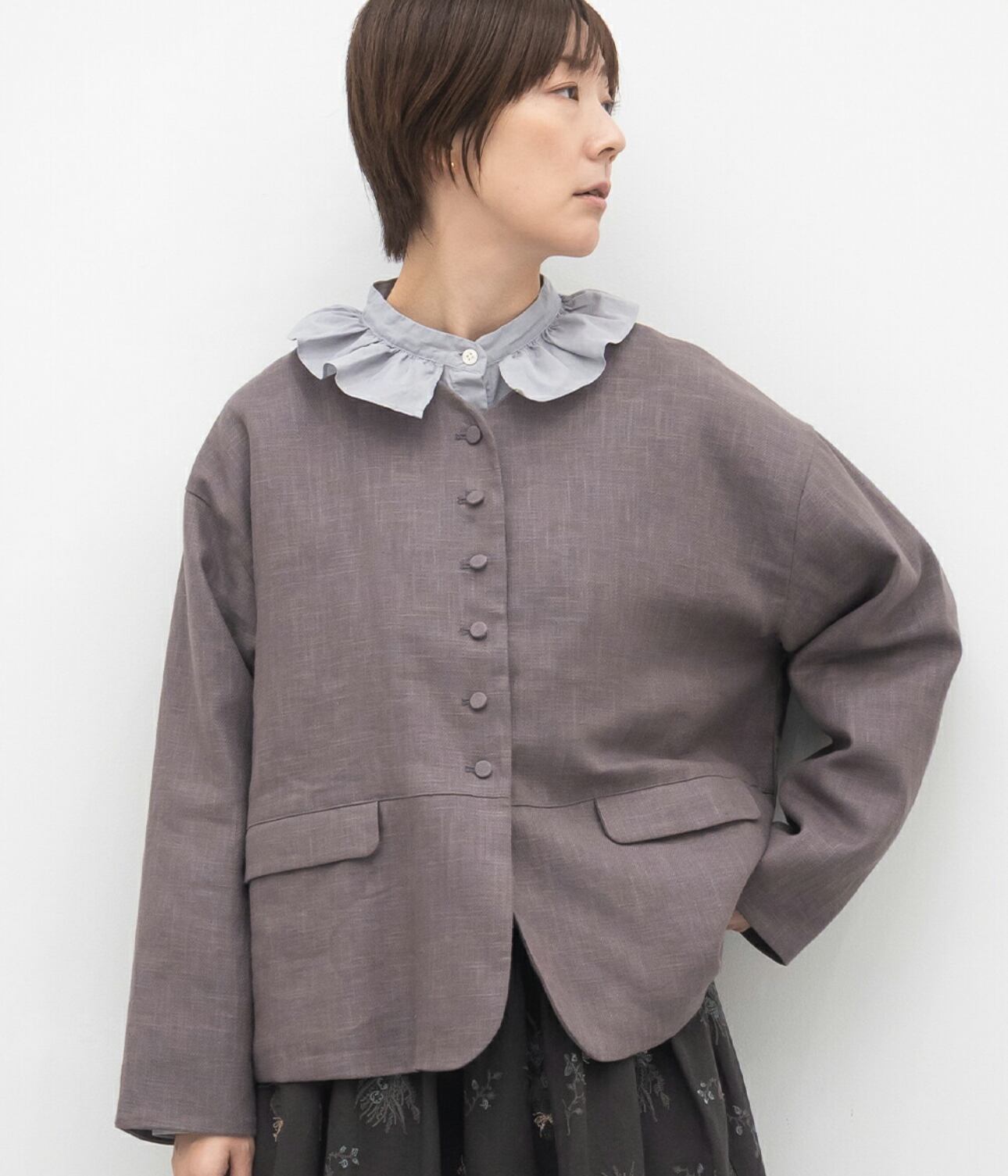 麻の上品な雰囲気を感じられるリネンコットンノーカラージャケット。