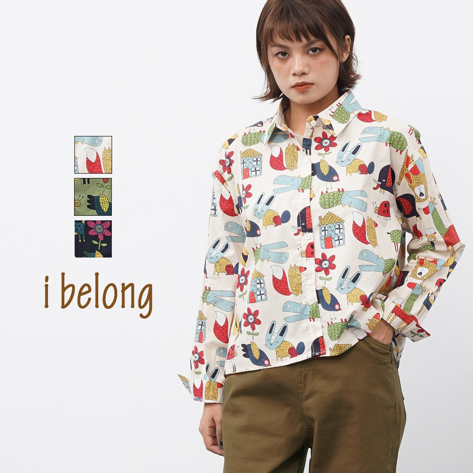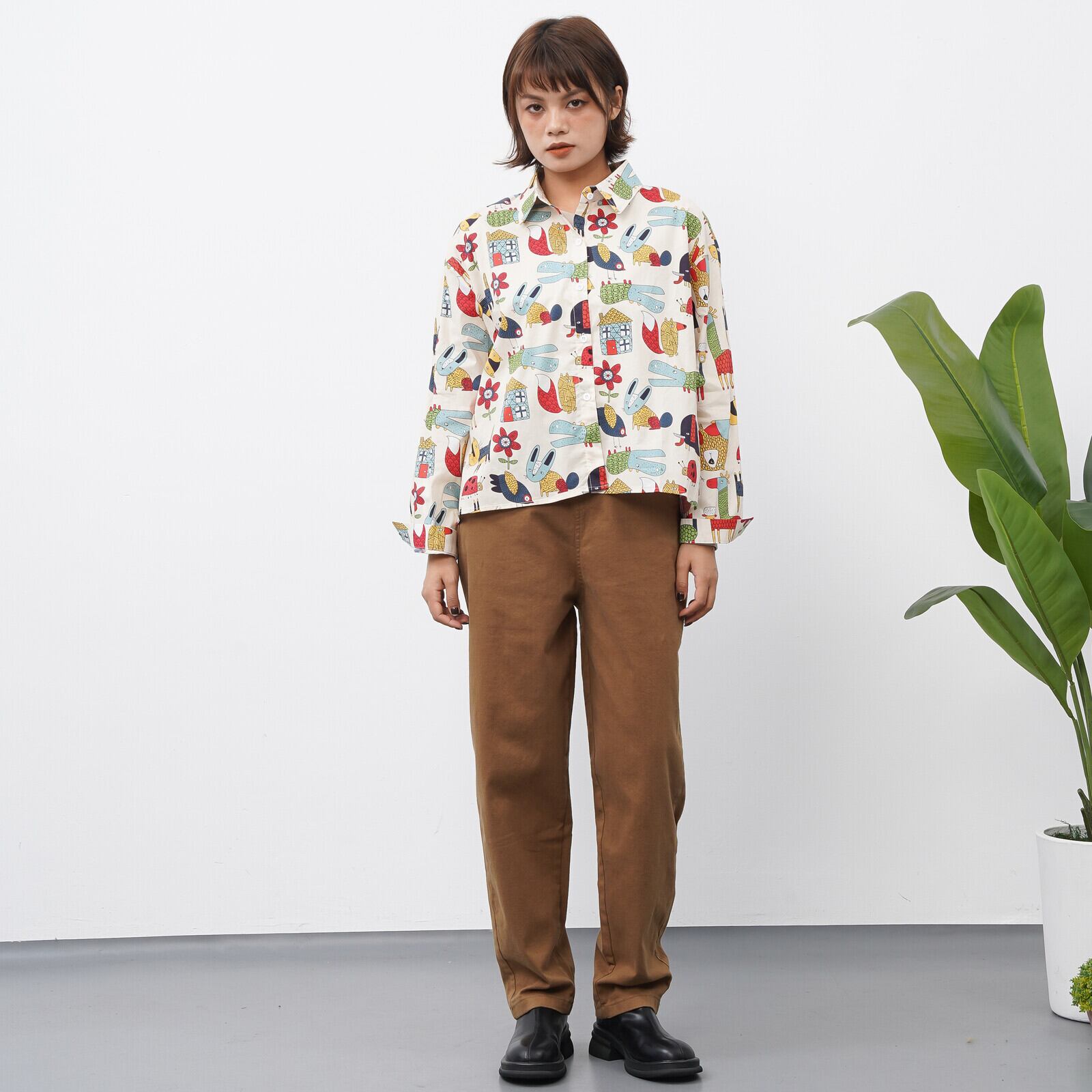 【新作】ユニークアニマル柄プリントシャツ ショート丈 長袖 ボックス 綿100% 3色展開