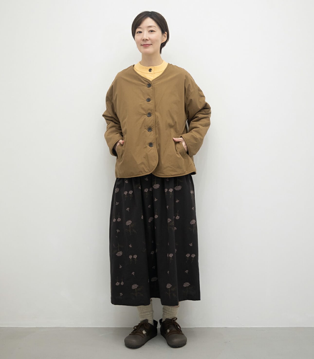 ゆったりと肩が落ちるドロップショルダーとゆとりある身幅で着心地よく、裾に向かってすとんとしたシルエットでゆとりがありながらもすっきりとしたイメージです。