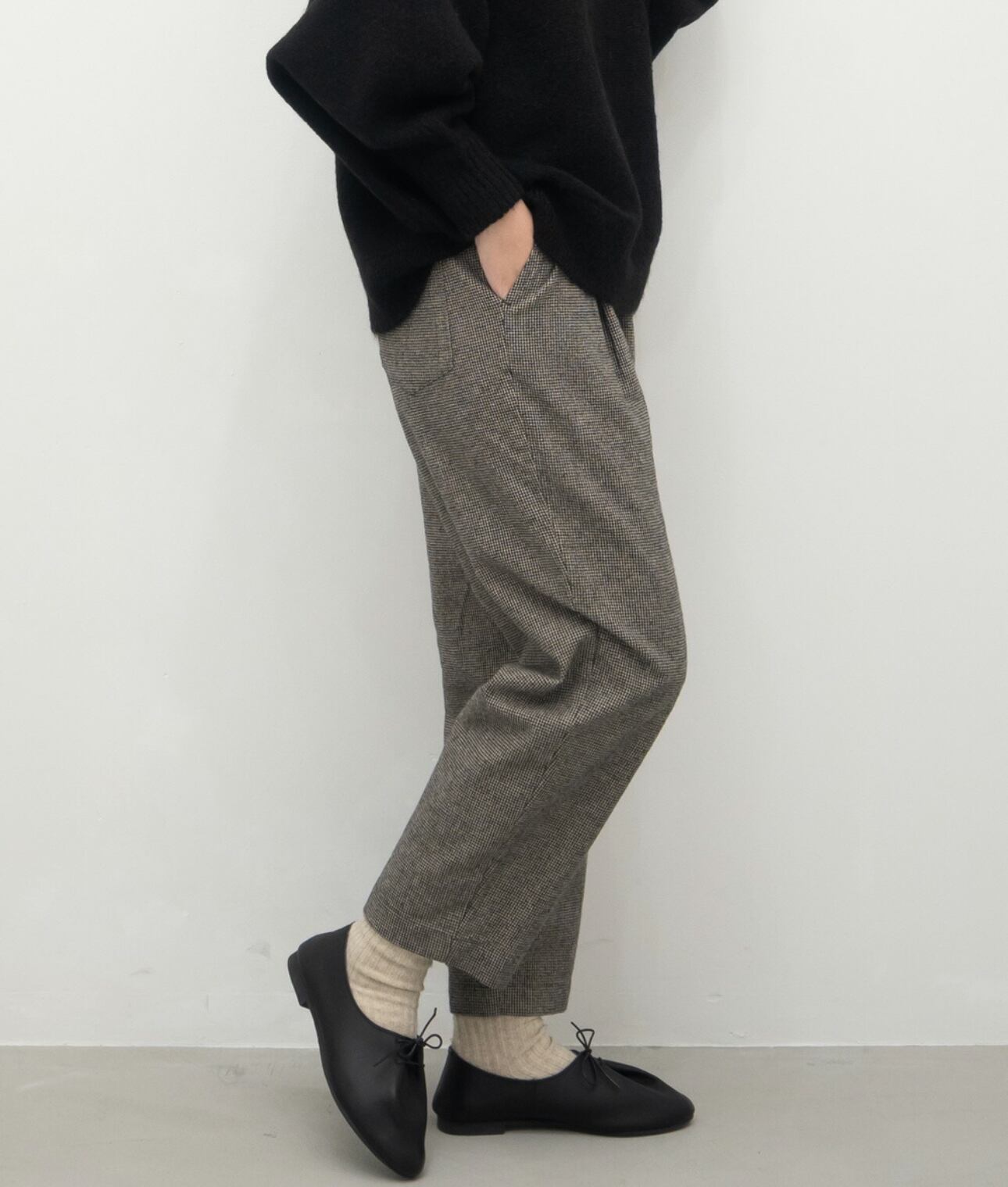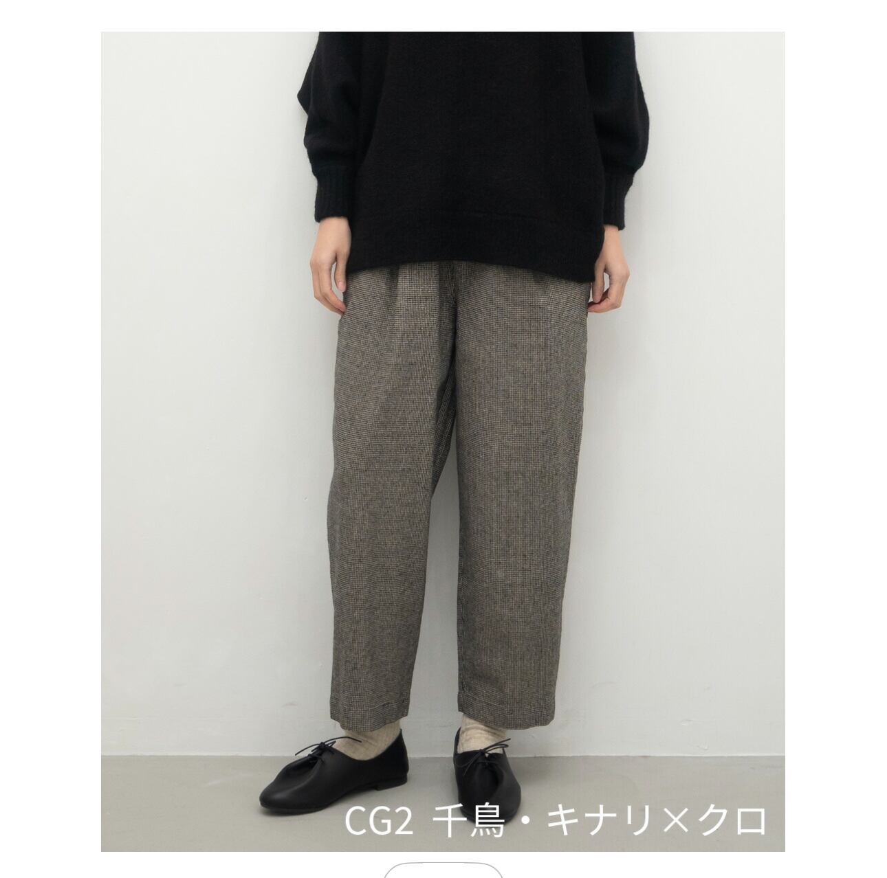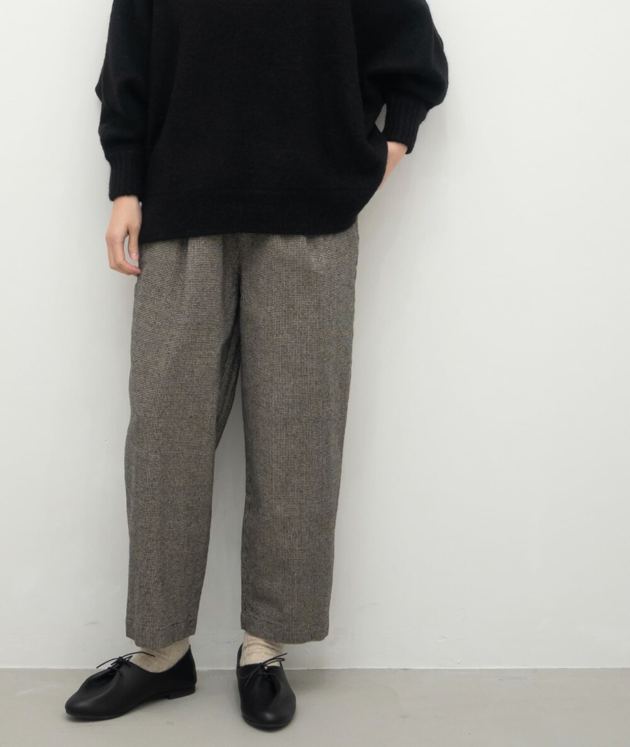 自然なウエストギャザーとタックの程よくゆとりある腰回りで、裾に向かってすっきりとさせたテーパードシルエット。
