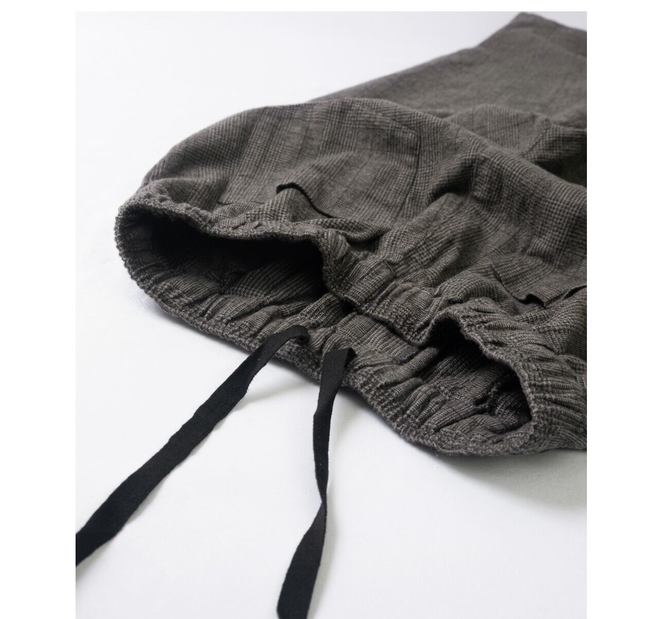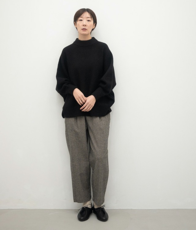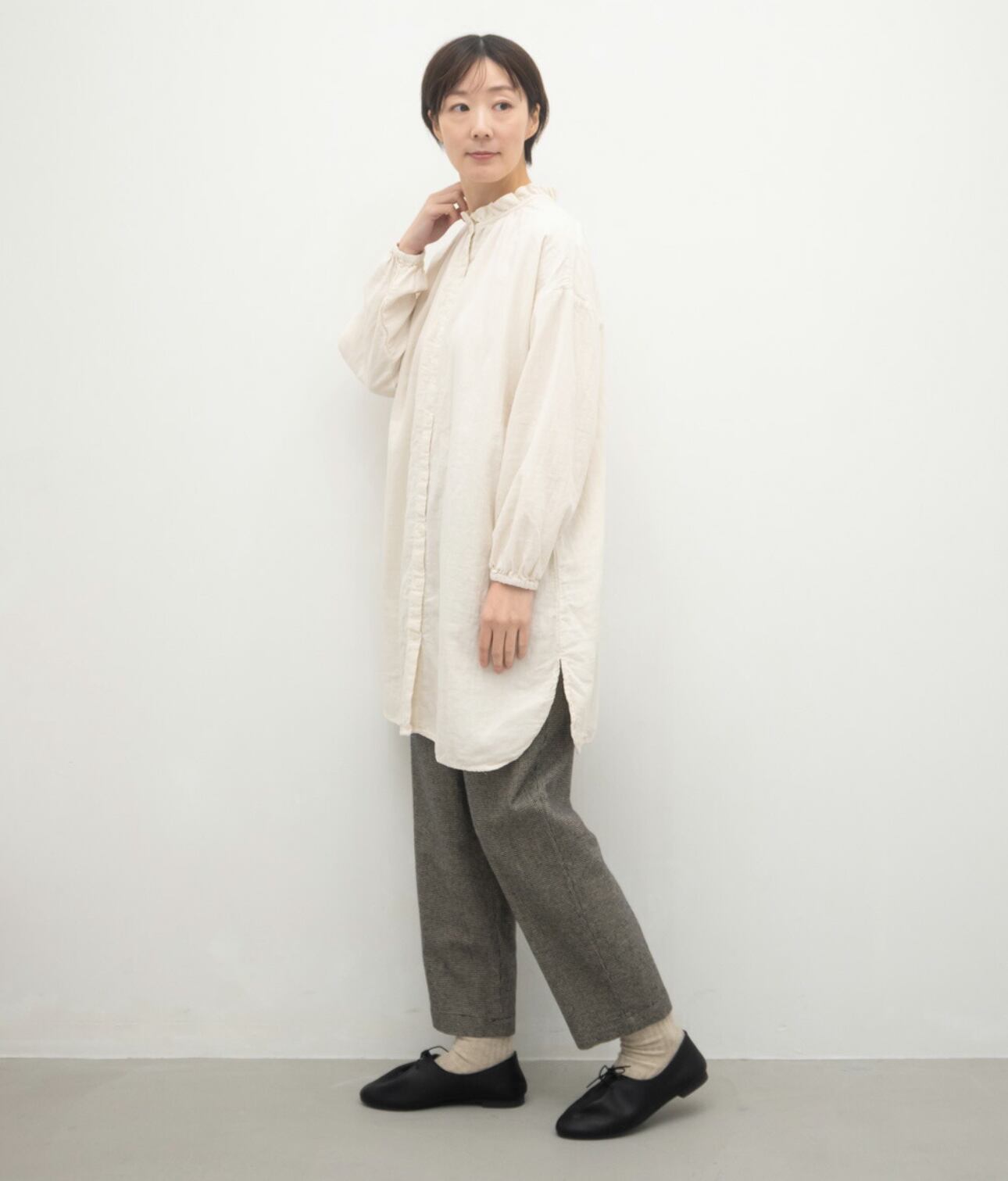 自然なウエストギャザーとタックの程よくゆとりある腰回りで、裾に向かってすっきりとさせたテーパードシルエット。