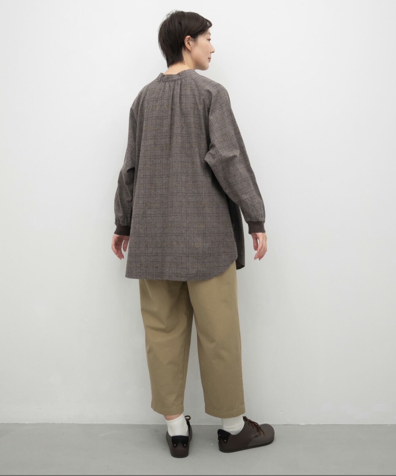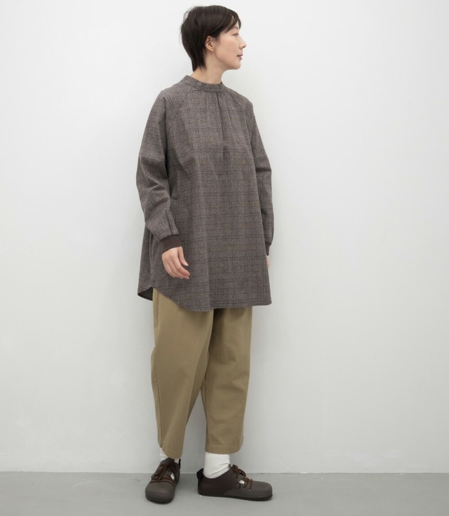 ゆったりと肩が落ちるワイドな身幅のラグランスリーブで着心地よく、後衿ぐりからはギャザーが入り裾に向かってふんわり広がる動きのあるシルエットをつくります。