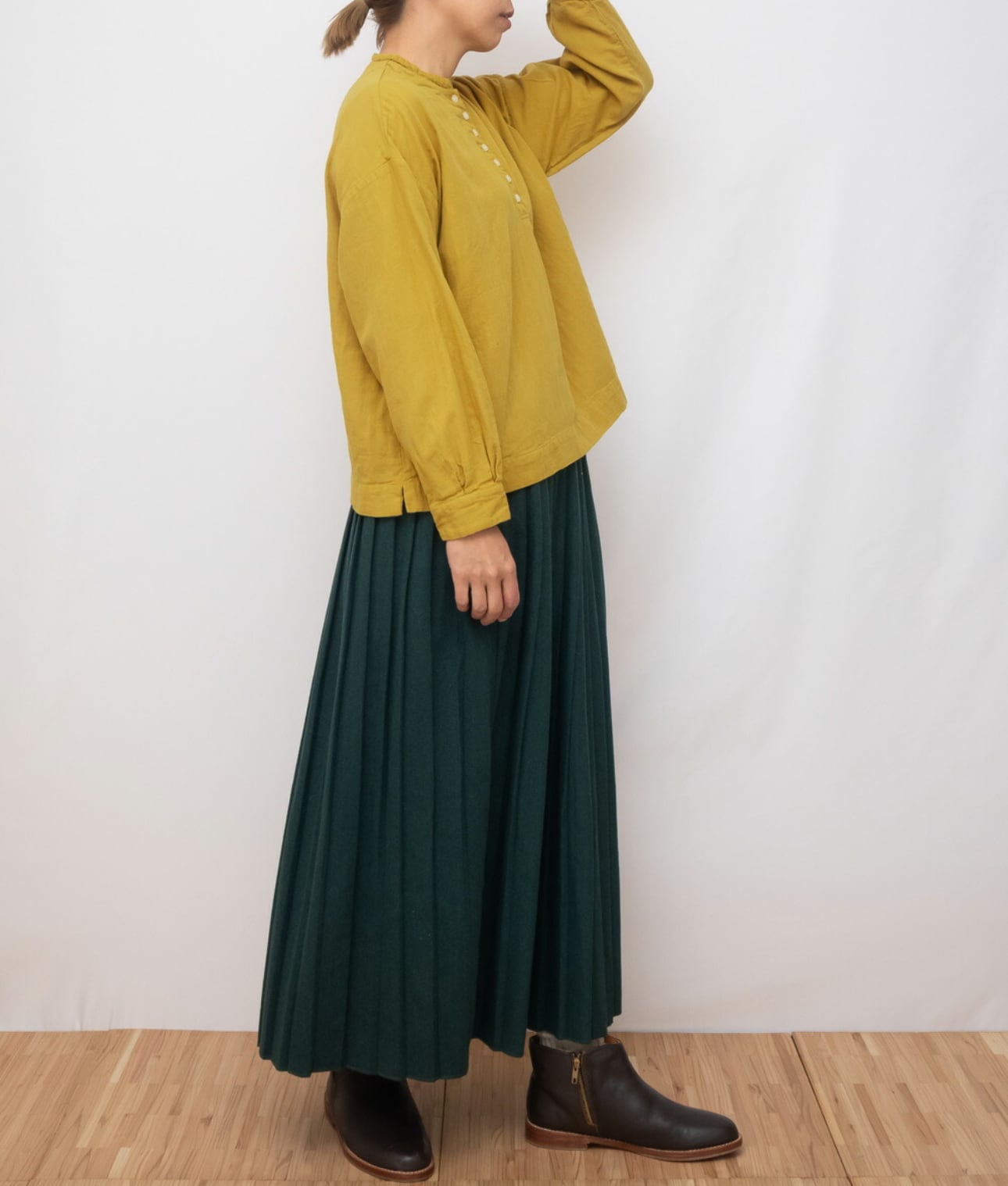 首元は細幅のスタンドカラーでさり気ない雰囲気を演出し、袖にはタックを入れふんわりふくらみのあるデザインです。