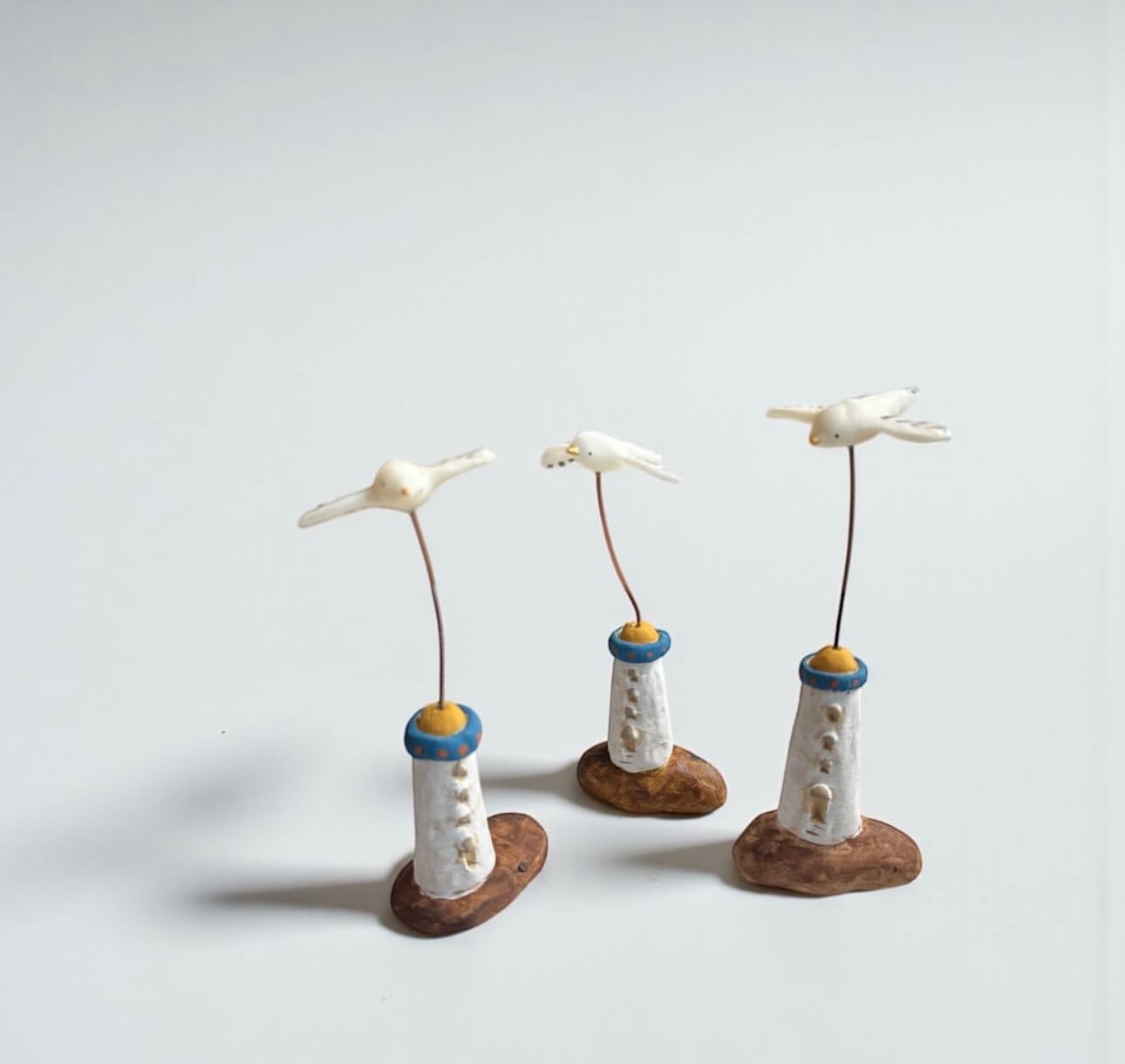 ブランド ねこめ 陶器オブジェ 高さ11cm〜13cm 少しずつ鳥や灯台が違いますので こちらで選んで発送させて頂きます