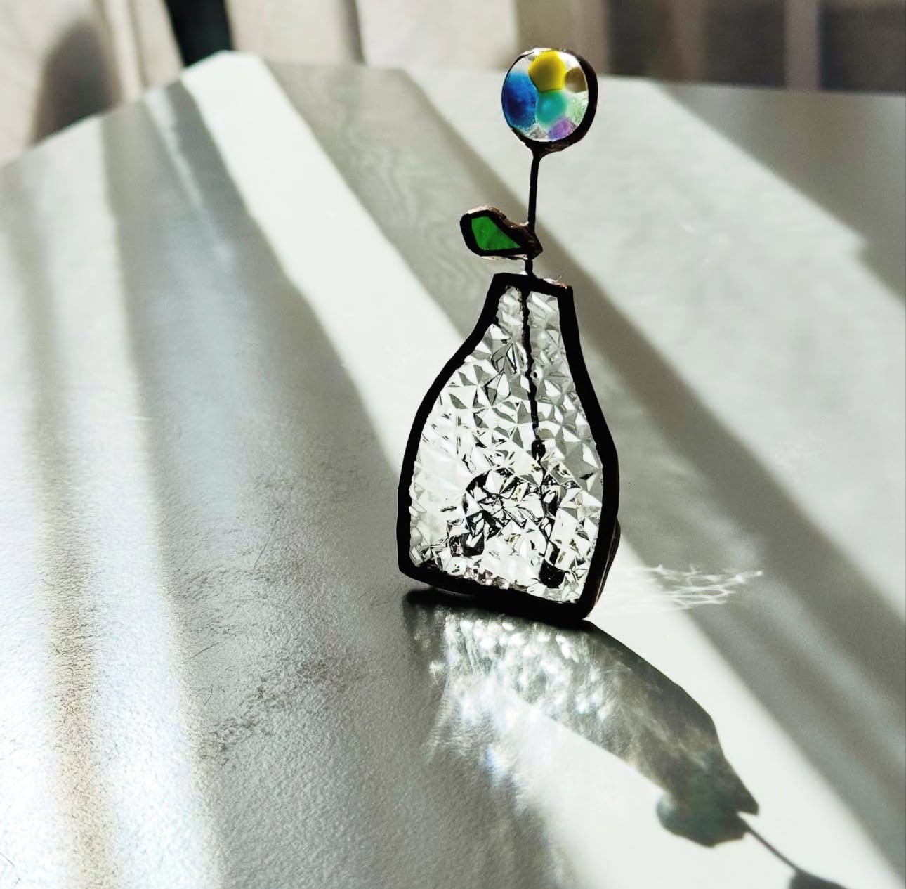 ブランド ロバの小屋 ステンドグラス ガラス 高さ9cm 一輪と一輪挿しはくっついてますので このまま光のあたる場所に飾ると可愛いです