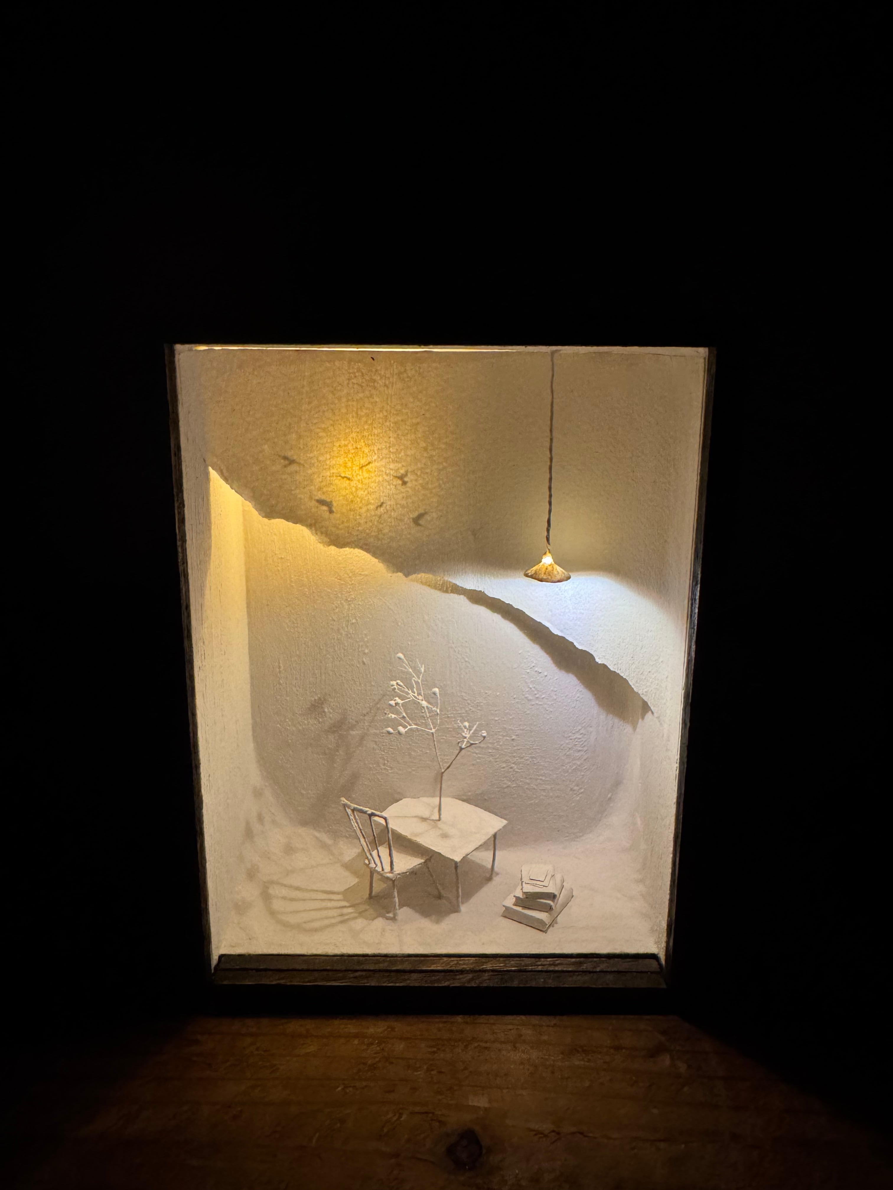 ブランド オオタ コウキ 彫刻ワイヤーアート 木箱 アクリル板 高さ17cm 幅13cm 奥行き6cm 灯りはボタン電池