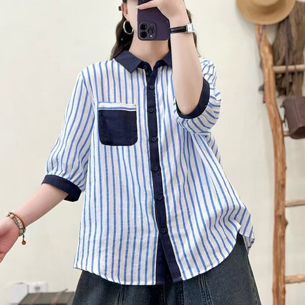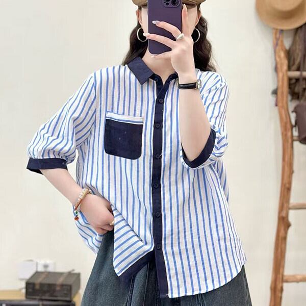 ダブルガーゼ・パイピングxストライプ柄コットンシャツ・ブラウス