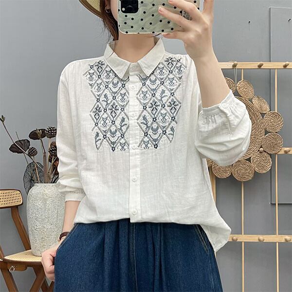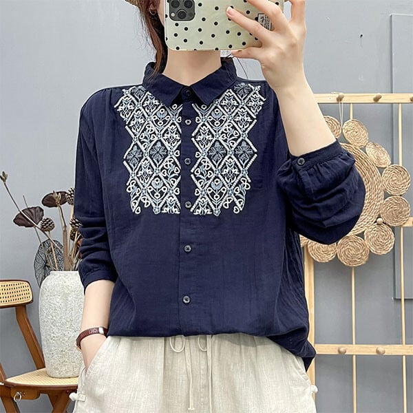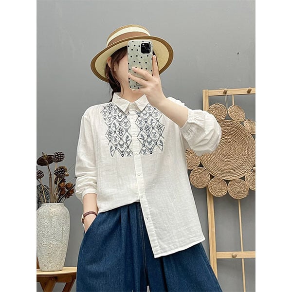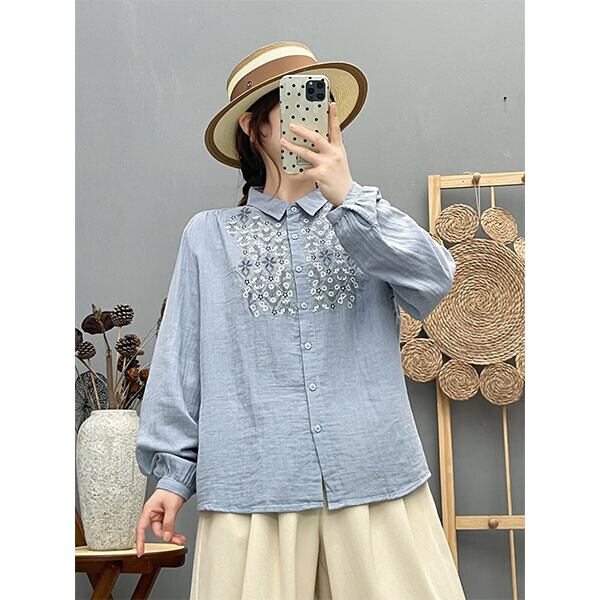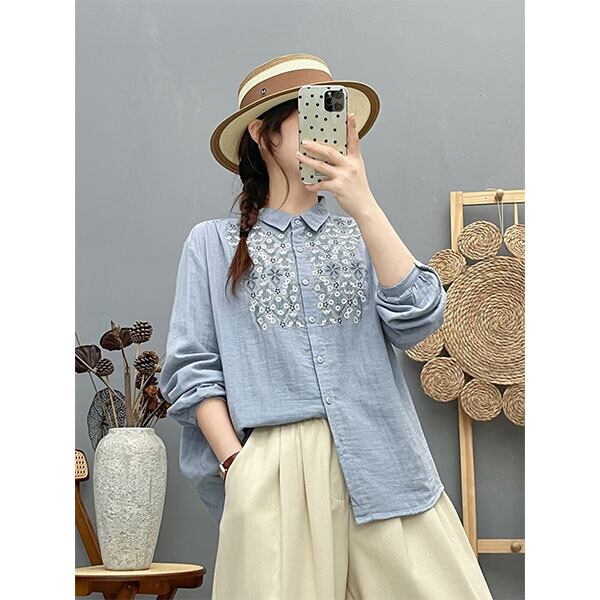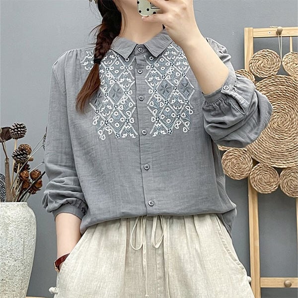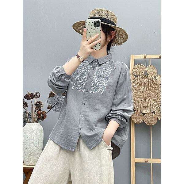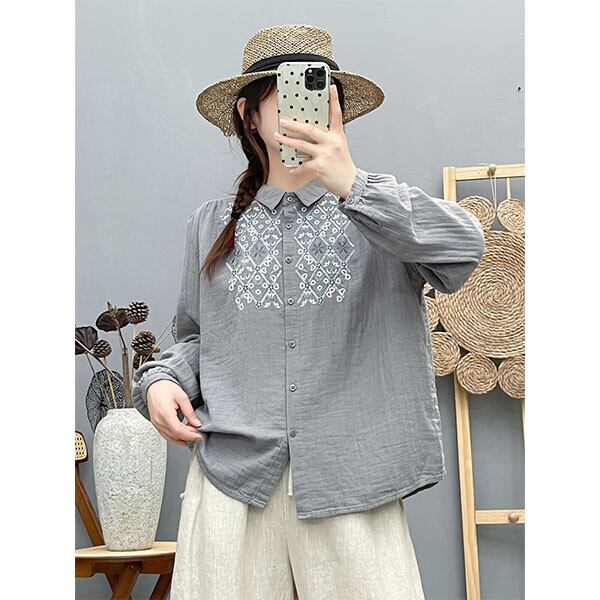 胸元刺繡入りダブルガーゼ・コットンシャツ・ブラウス グレー