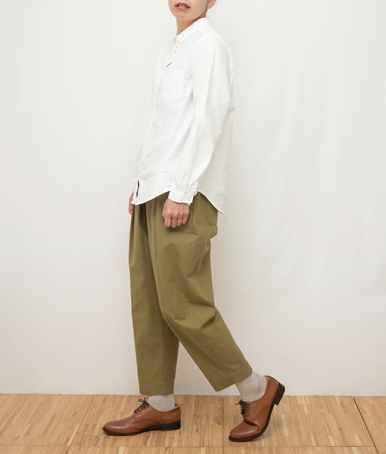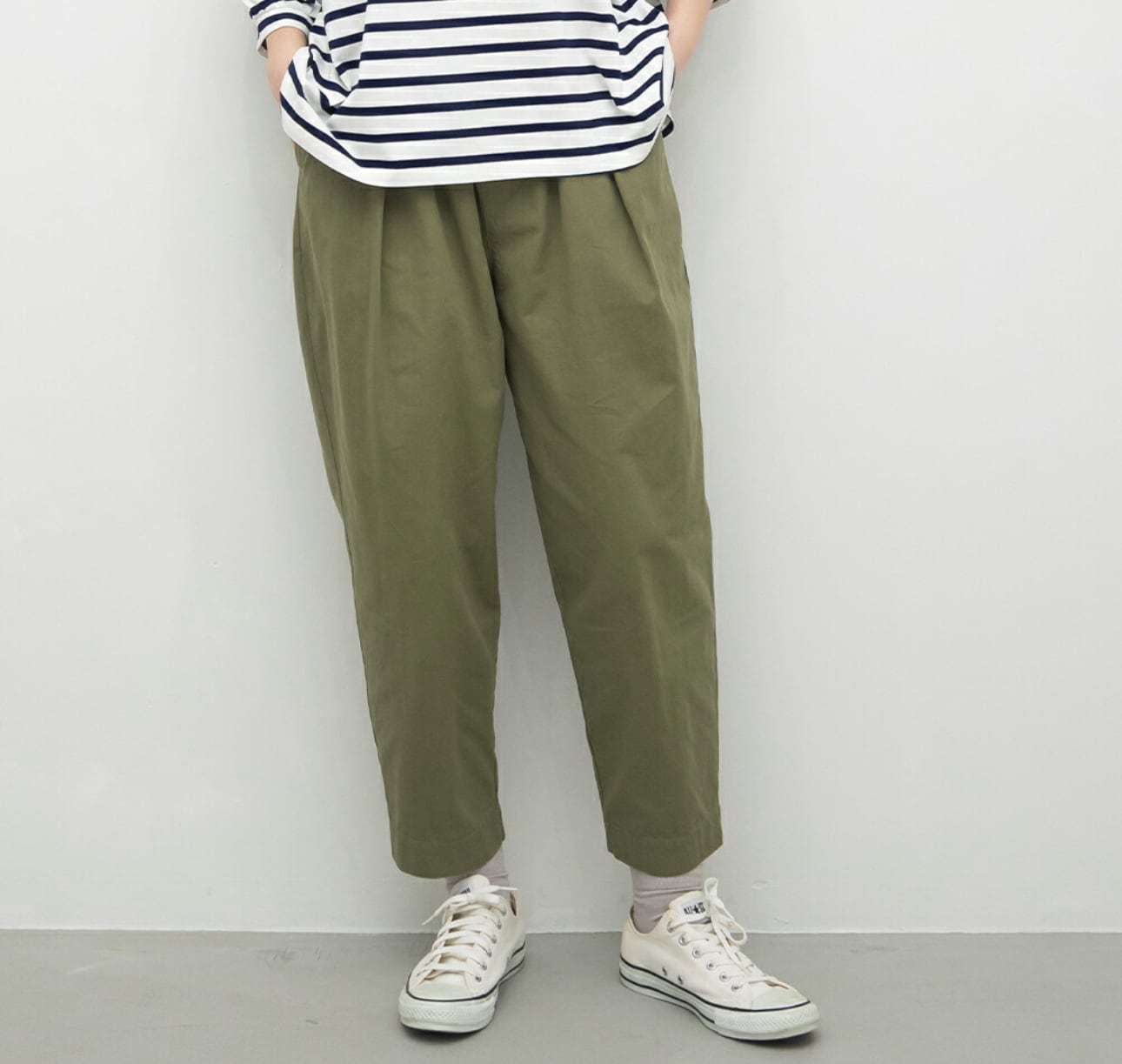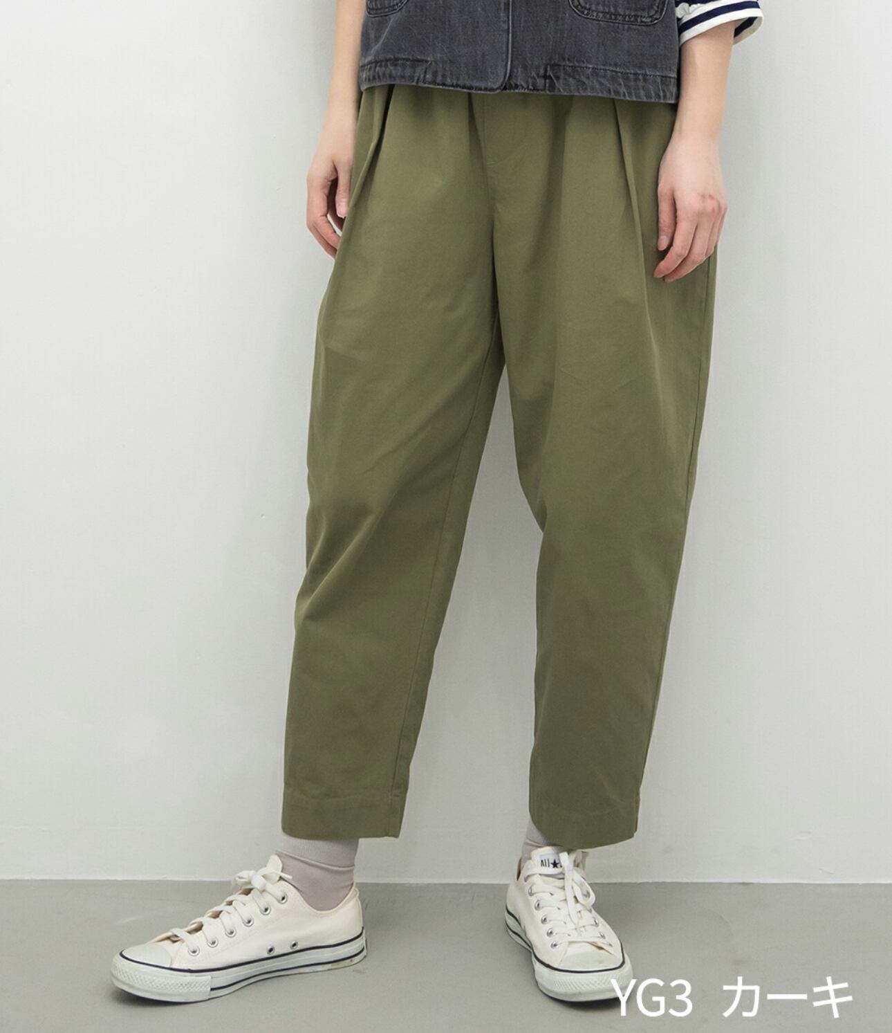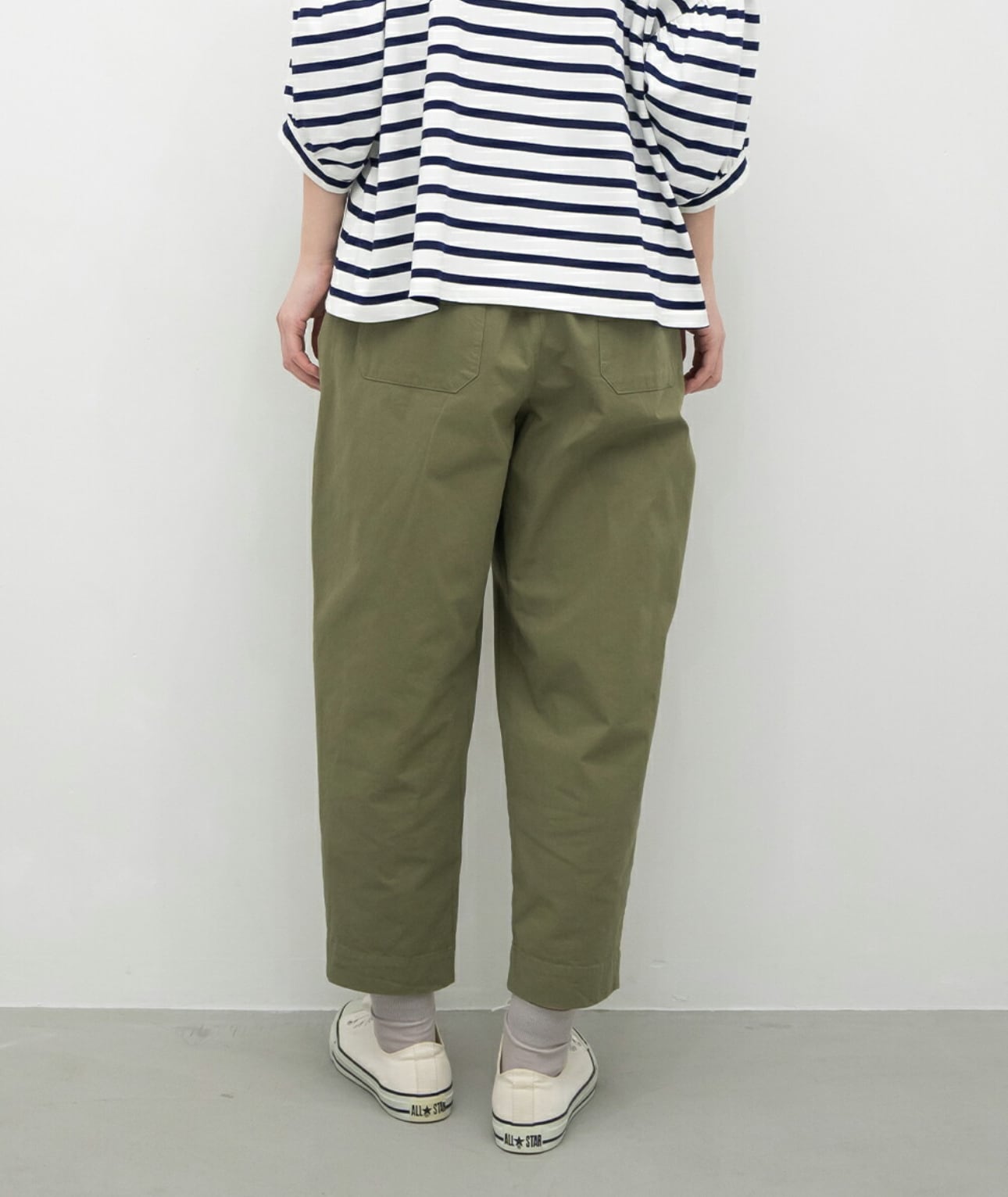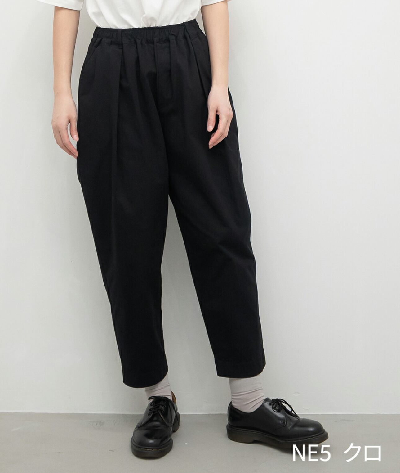 自然なウエストギャザーとタックの程よくゆとりある腰回りで、裾に向かってすっきりとさせたテーパードシルエット。
