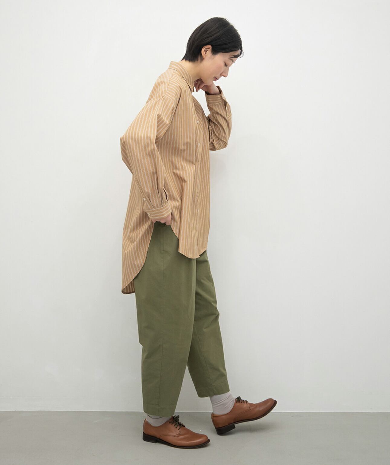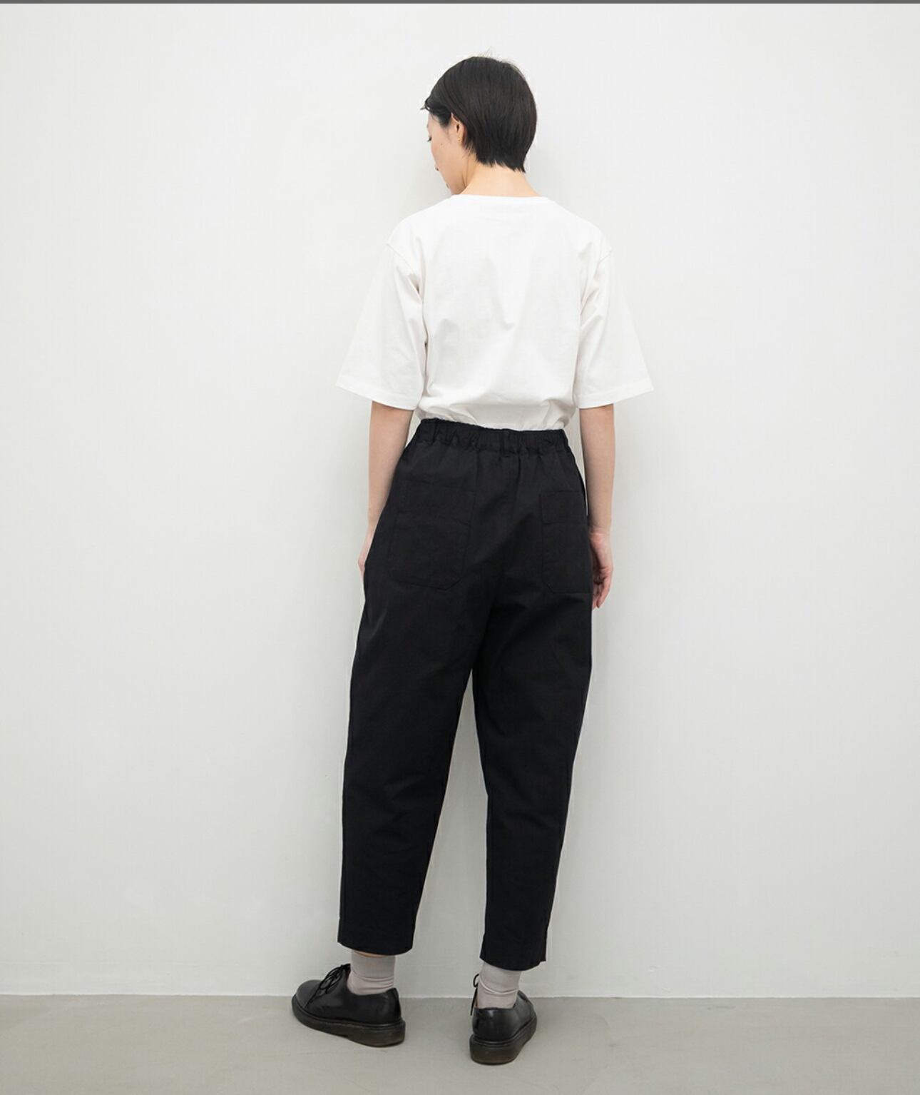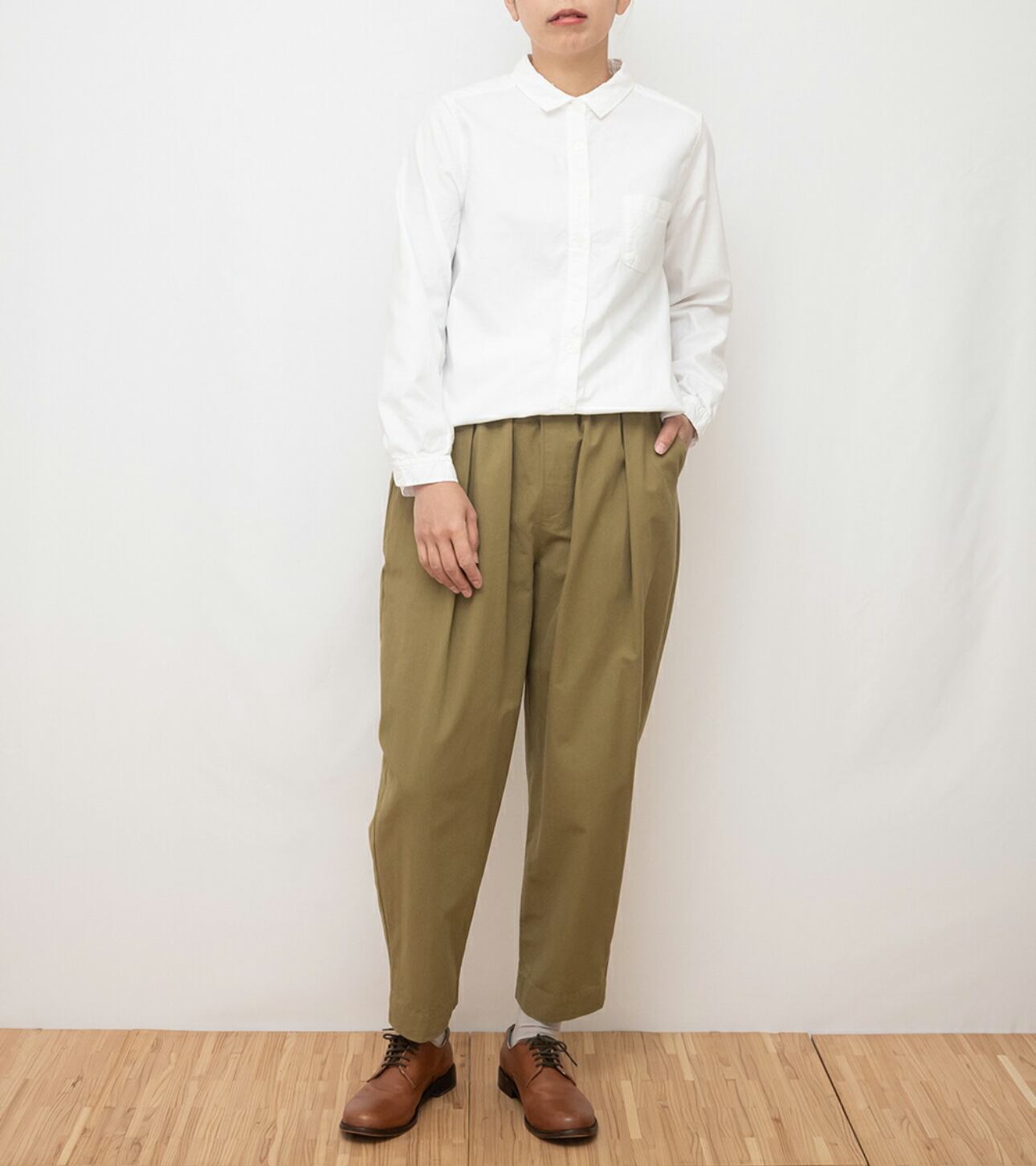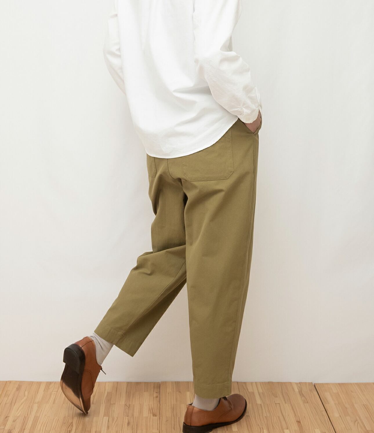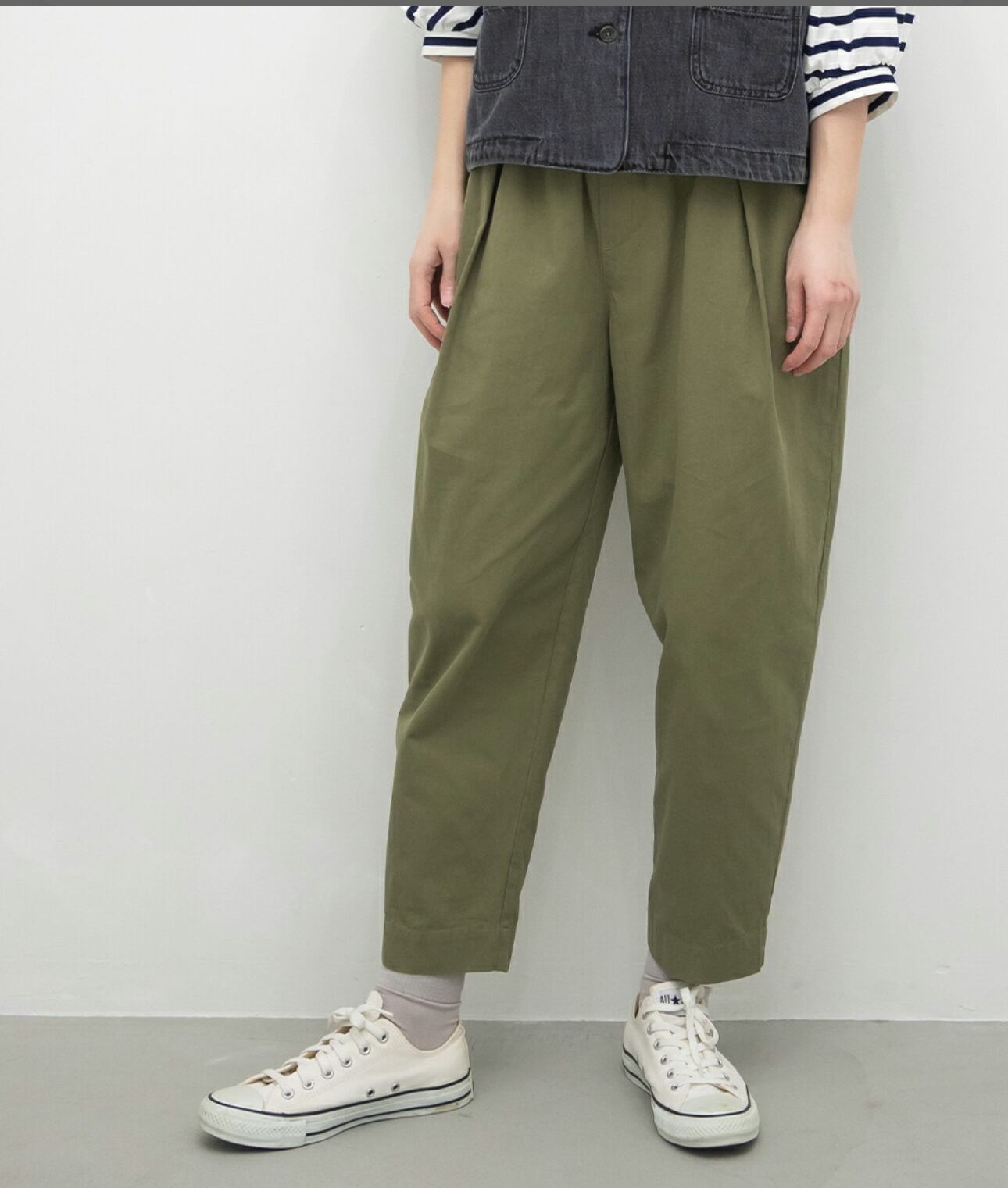 自然なウエストギャザーとタックの程よくゆとりある腰回りで、裾に向かってすっきりとさせたテーパードシルエット。