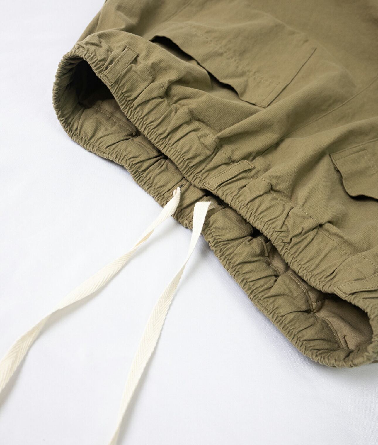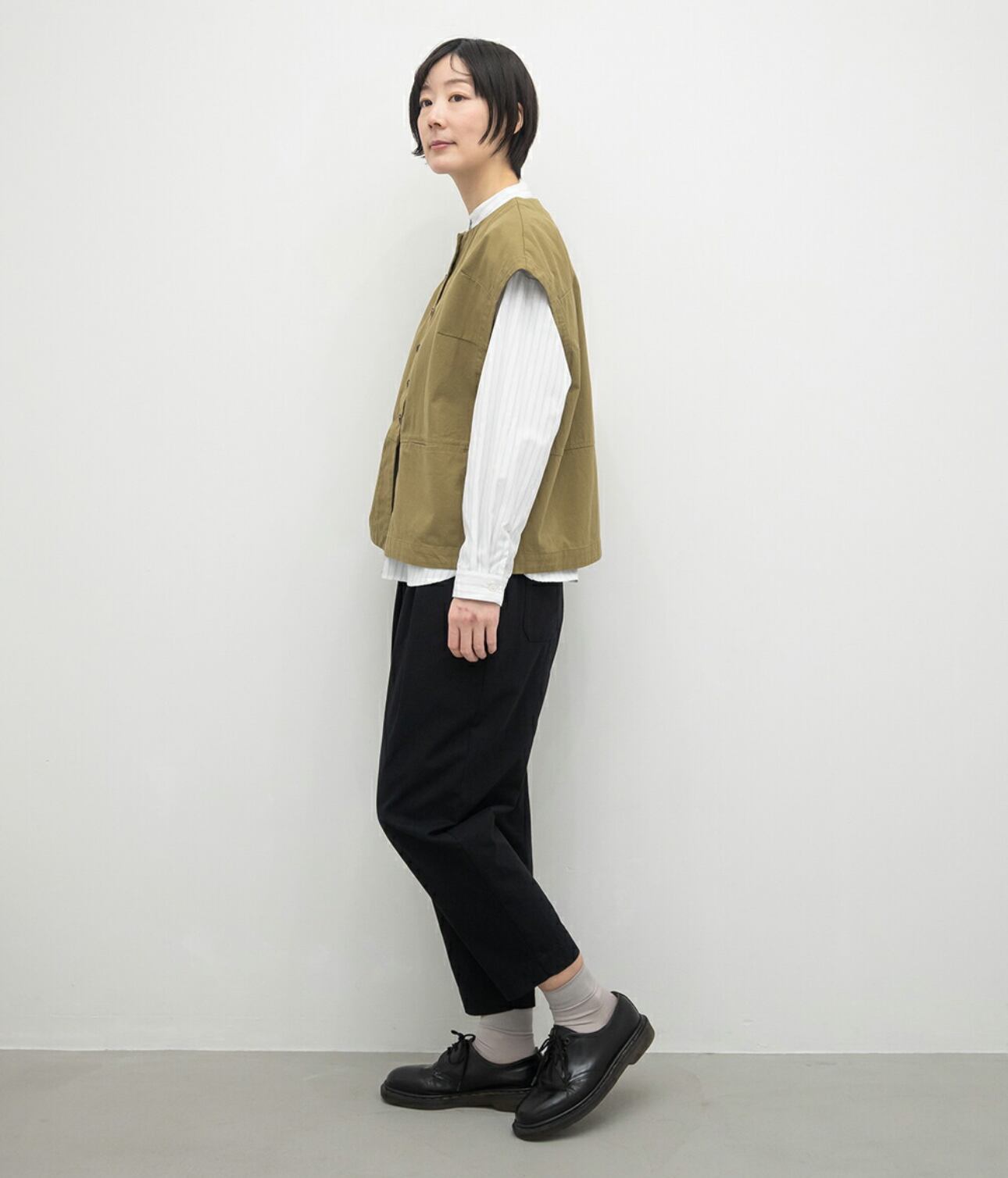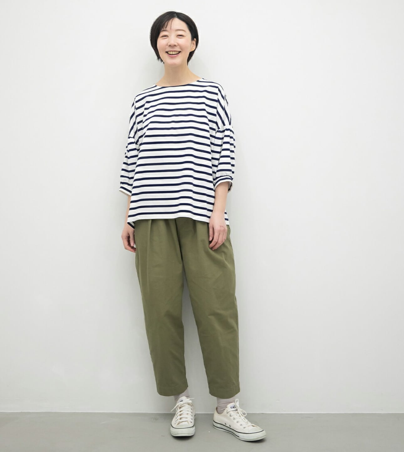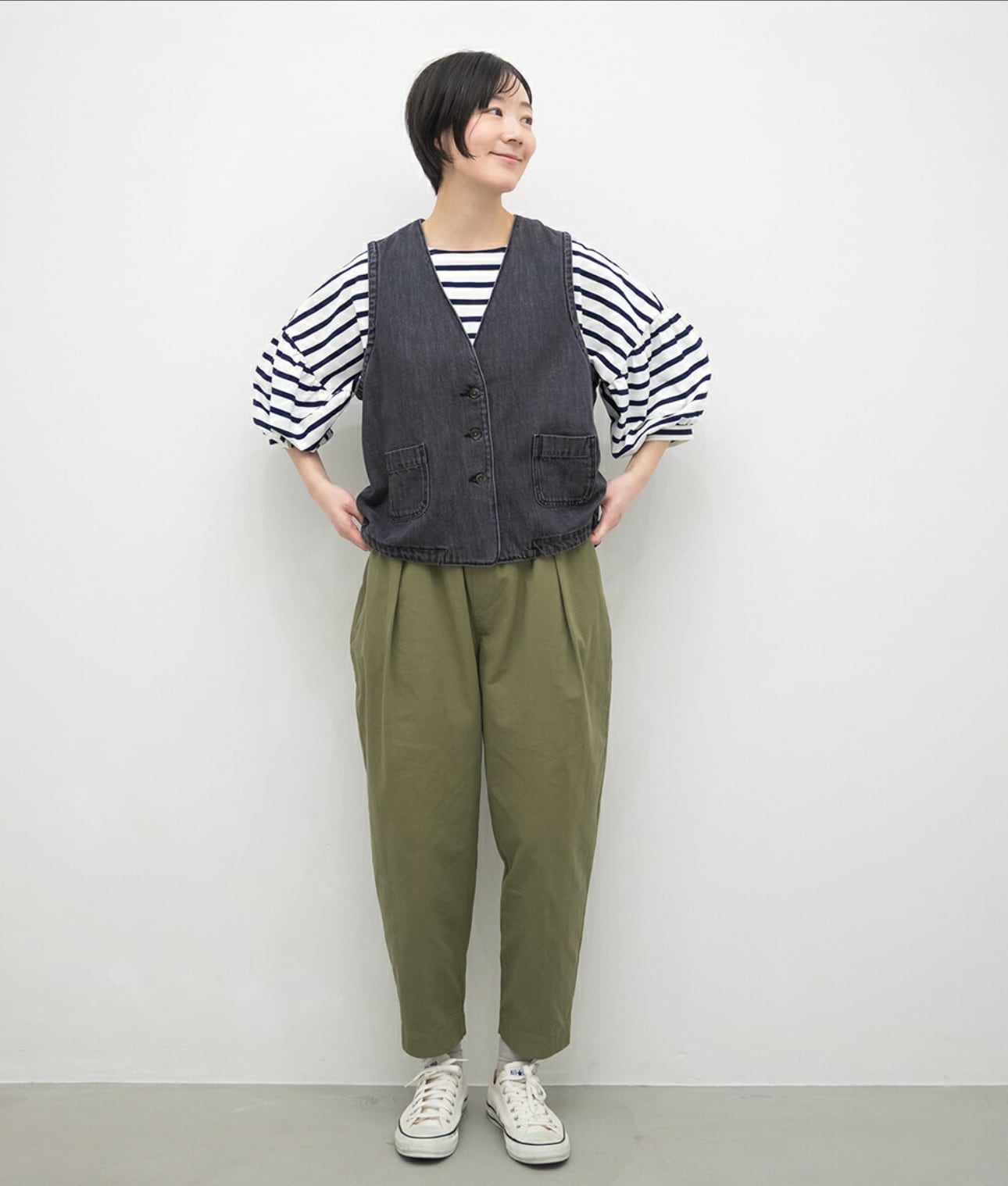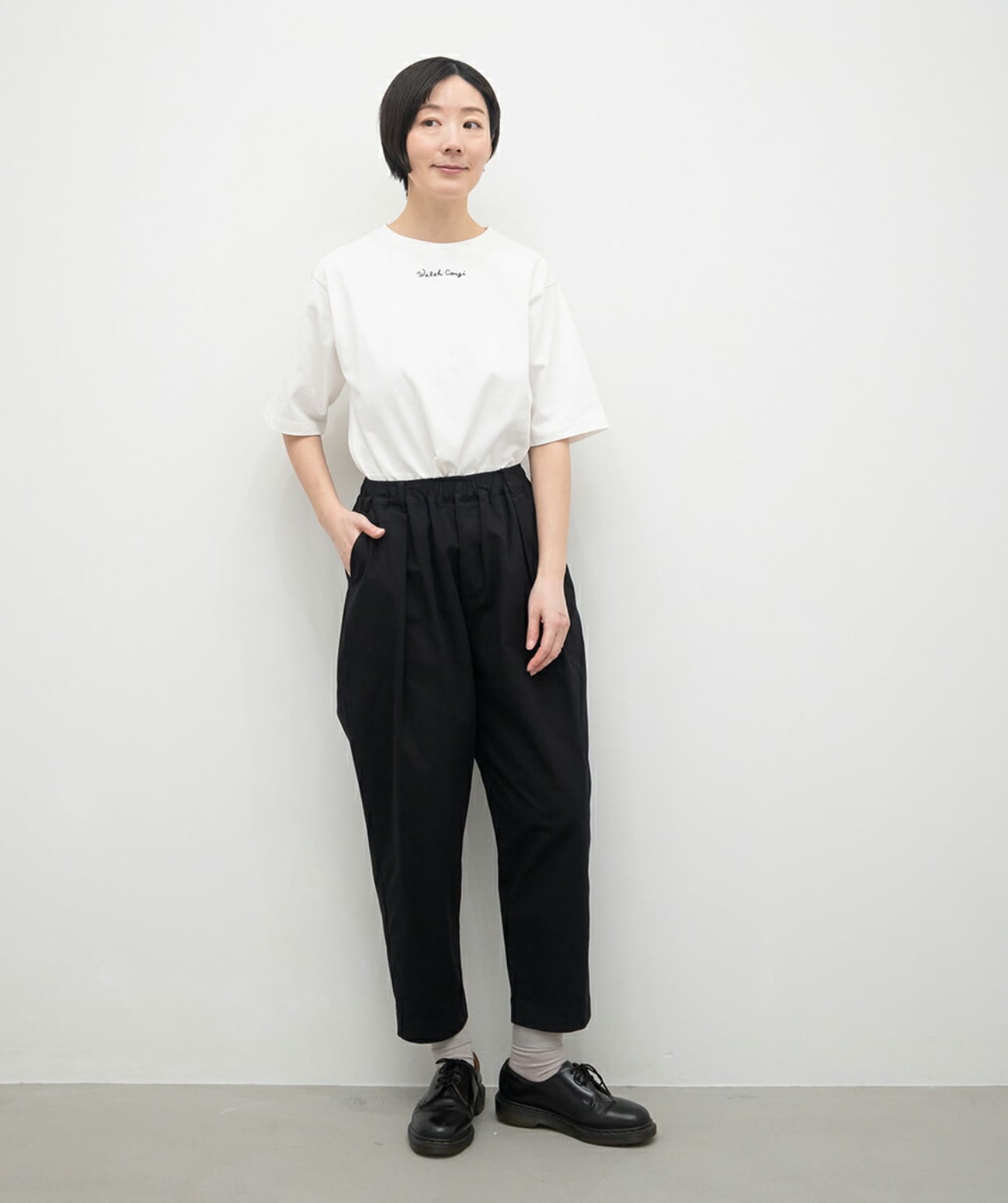 自然なウエストギャザーとタックの程よくゆとりある腰回りで、裾に向かってすっきりとさせたテーパードシルエット。