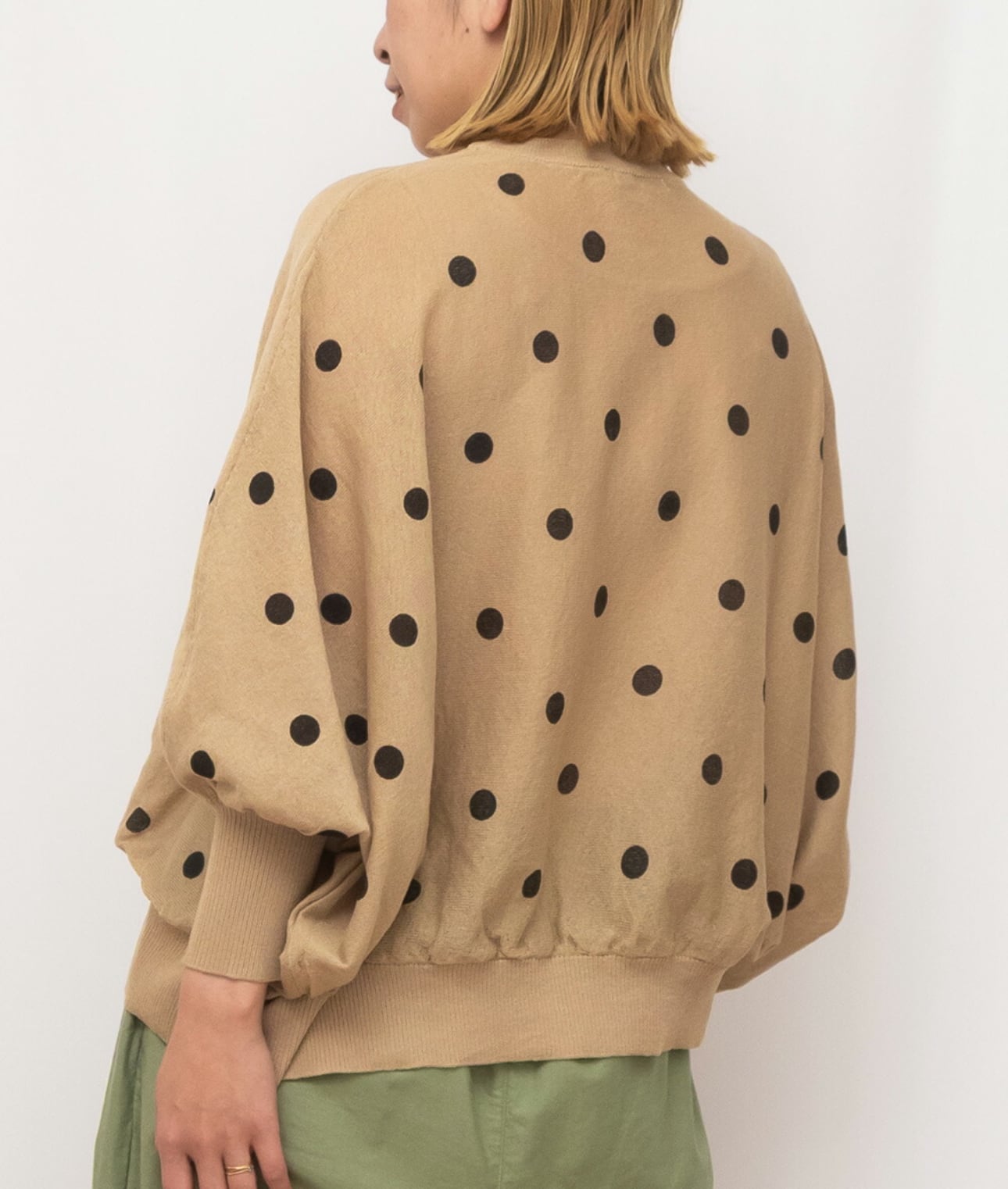 さらりとした軽い着心地の麻タッチポリエステル天竺ドットプリントドルマンプルオーバー。