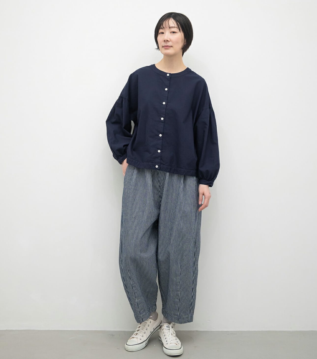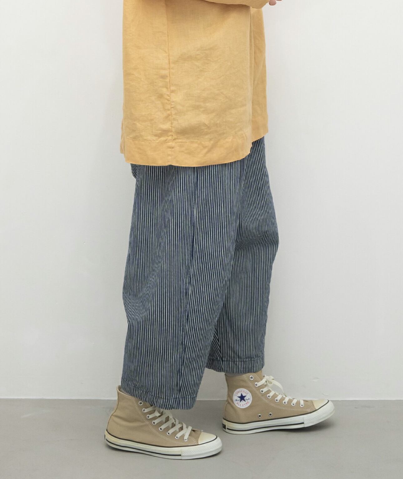 ゆったりとした腰回りと深めの股上で履き心地よく、裾からはダーツが入りまたサイドのカーブ切替えなど、ふんわり立体的に仕上げたバレルシルエットです。