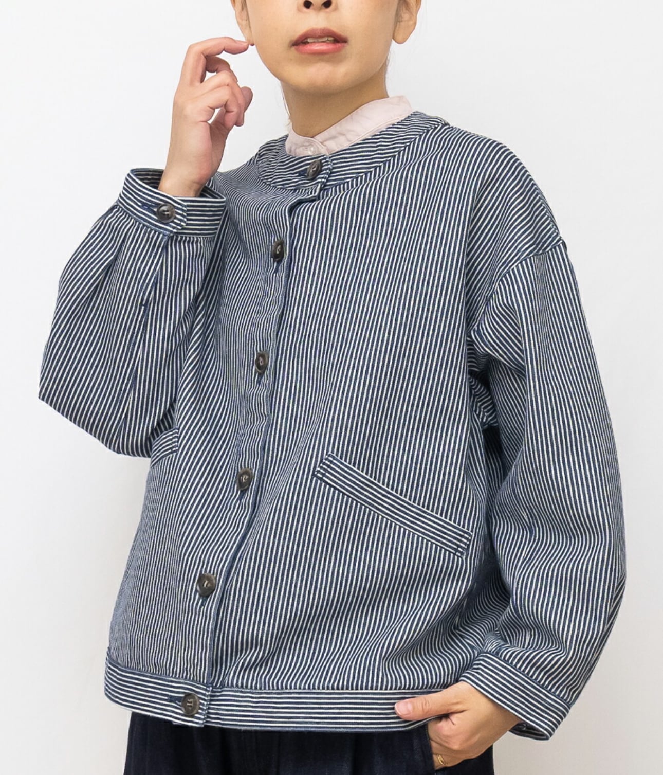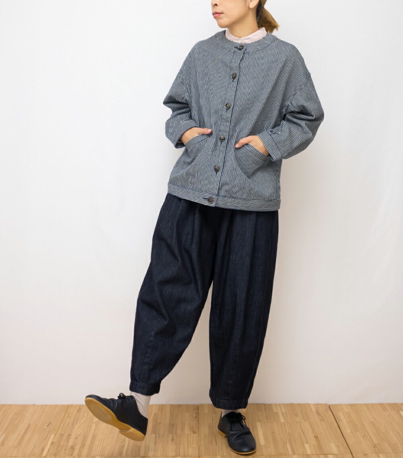 ボタンを留めてコンパクトに着こなしたり、ワンピースにさっと羽織ったり、また同素材のボトムスとのセットアップコーデなど着こなしアレンジしやすいアイテムです。