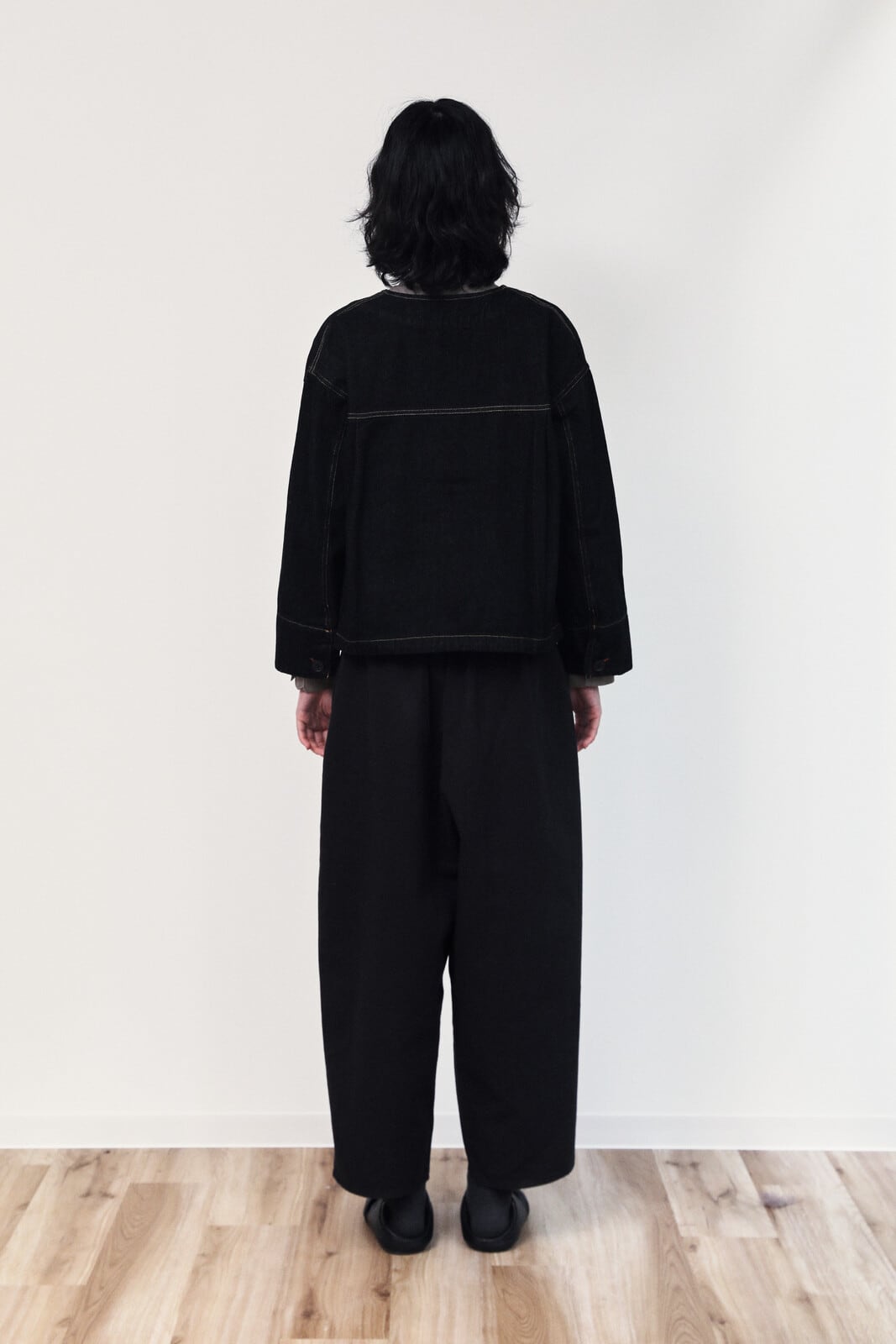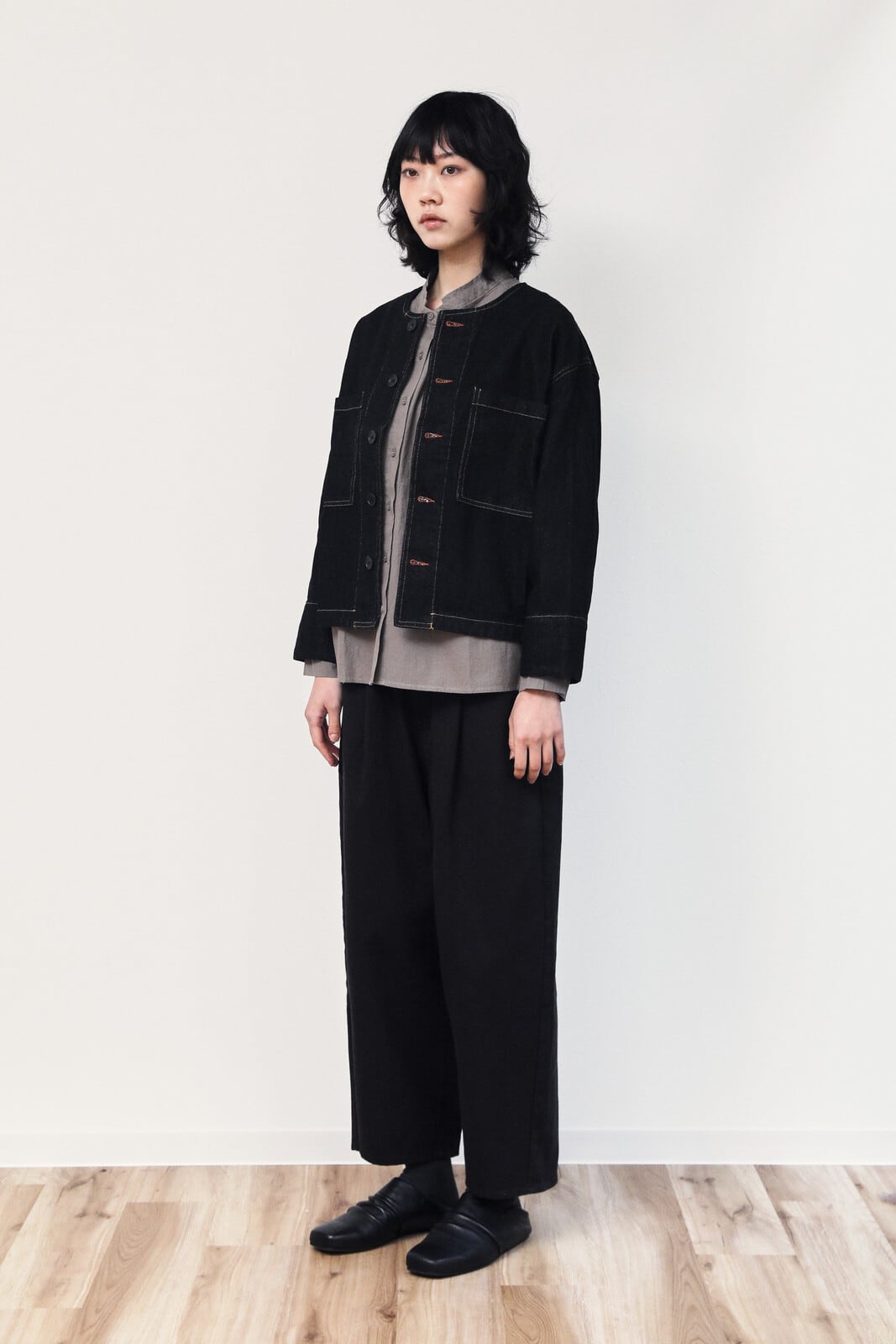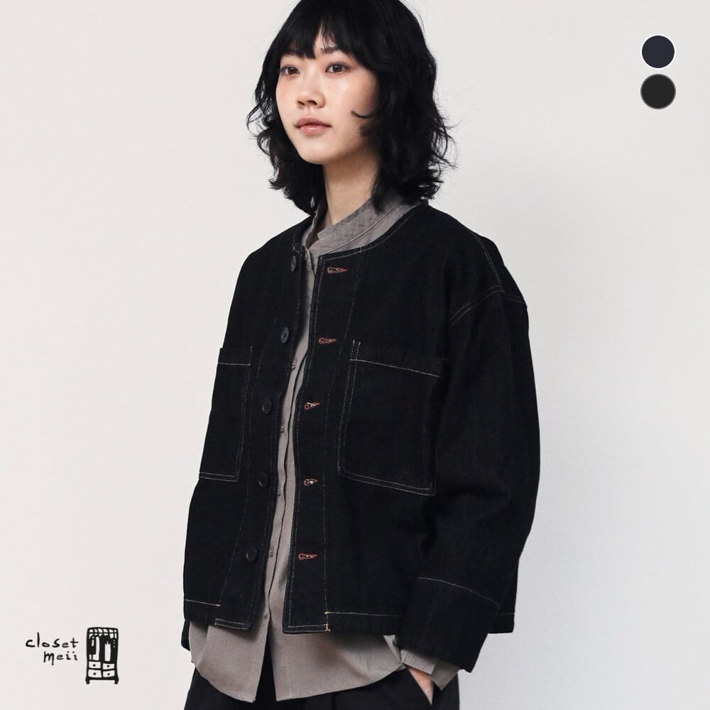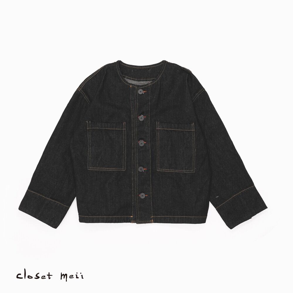ラウンドネック ワイド前立て スタンダードシルエット デニムショートジャケット ブラック