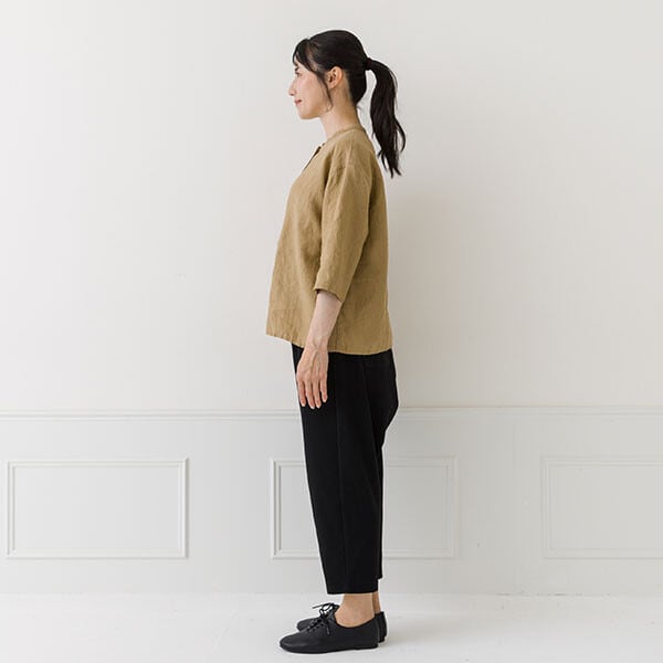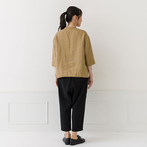 ●素材 ・上質なリネンを100%使用し、暑い日もさらりとした肌触りで涼しく快適に過ごせます。・通気性と吸水性に優れた天然素材で、汗をかいてもべたつきにくく、清涼感が持続します。・着るほどに肌に馴染み、柔らかく風合いが増すため、長く愛用していただけます。