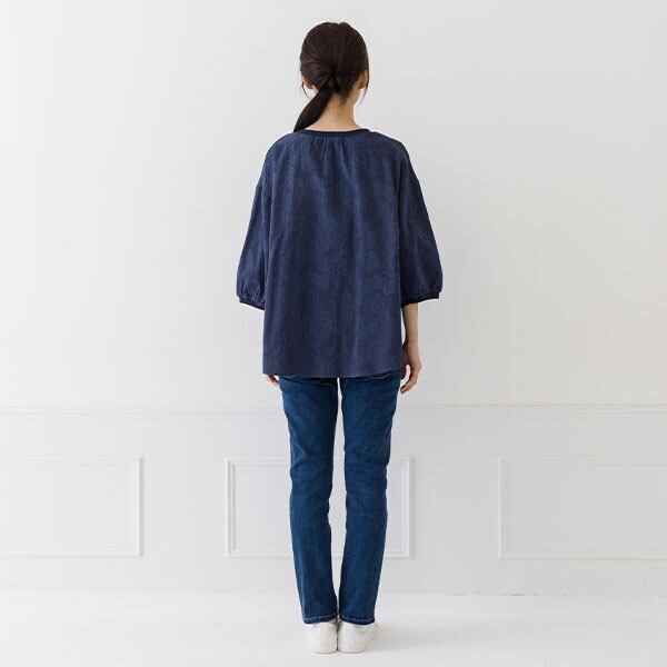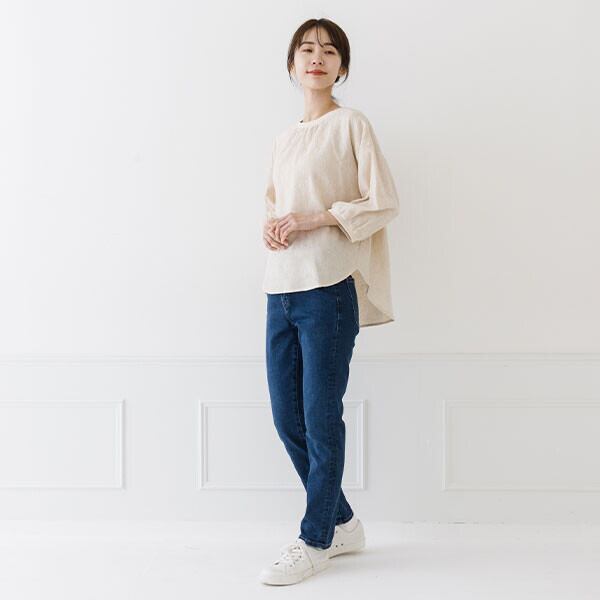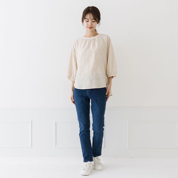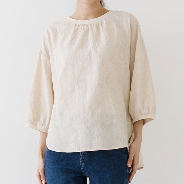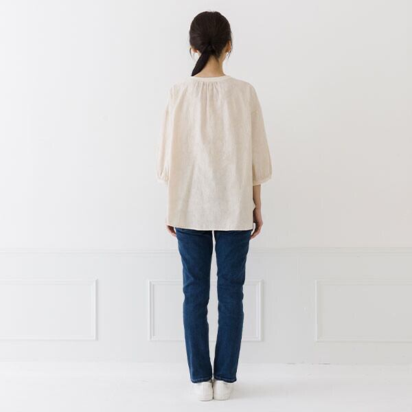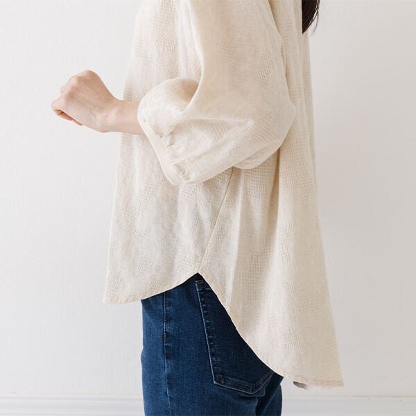 「表情豊かなフラワージャガード。光の加減で変わる陰影を愉しむ。」綿100%のフラワージャガードが美しい7分袖ブラウス。