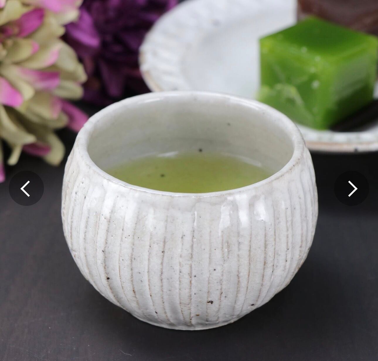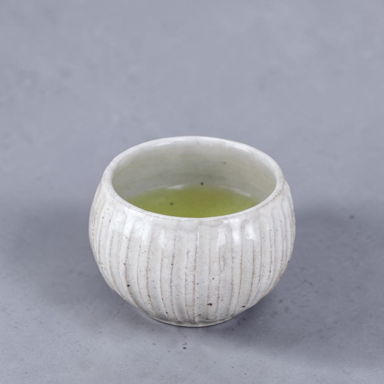 岐阜県土岐市にあります美濃焼の窯元「山王窯」より。伝統工芸士の大野繁保氏がロクロで作り、削りを入れた粉引き湯呑です。器の側面部分に伝統工芸士が彫り込み模様を付けていきます。側面のカーブがある箇所に出来るだけ等間隔に彫り込みを入れるのは見た目以上に難しい技で熟練工芸士でないと難しい技です。素焼き後、白化粧土を全体に吹き付け焼成します。その後、粉引の器特有の染み込みを防ぐ釉薬を全体に掛けもう1度焼成しています。(器は素焼き・本焼成と2度焼くのが普通ですが、本品は3度窯入れし、焼成する手間を掛けた器です。)コロンとした形状が愛らしく、手作りのぬくもりを感じる湯呑です。