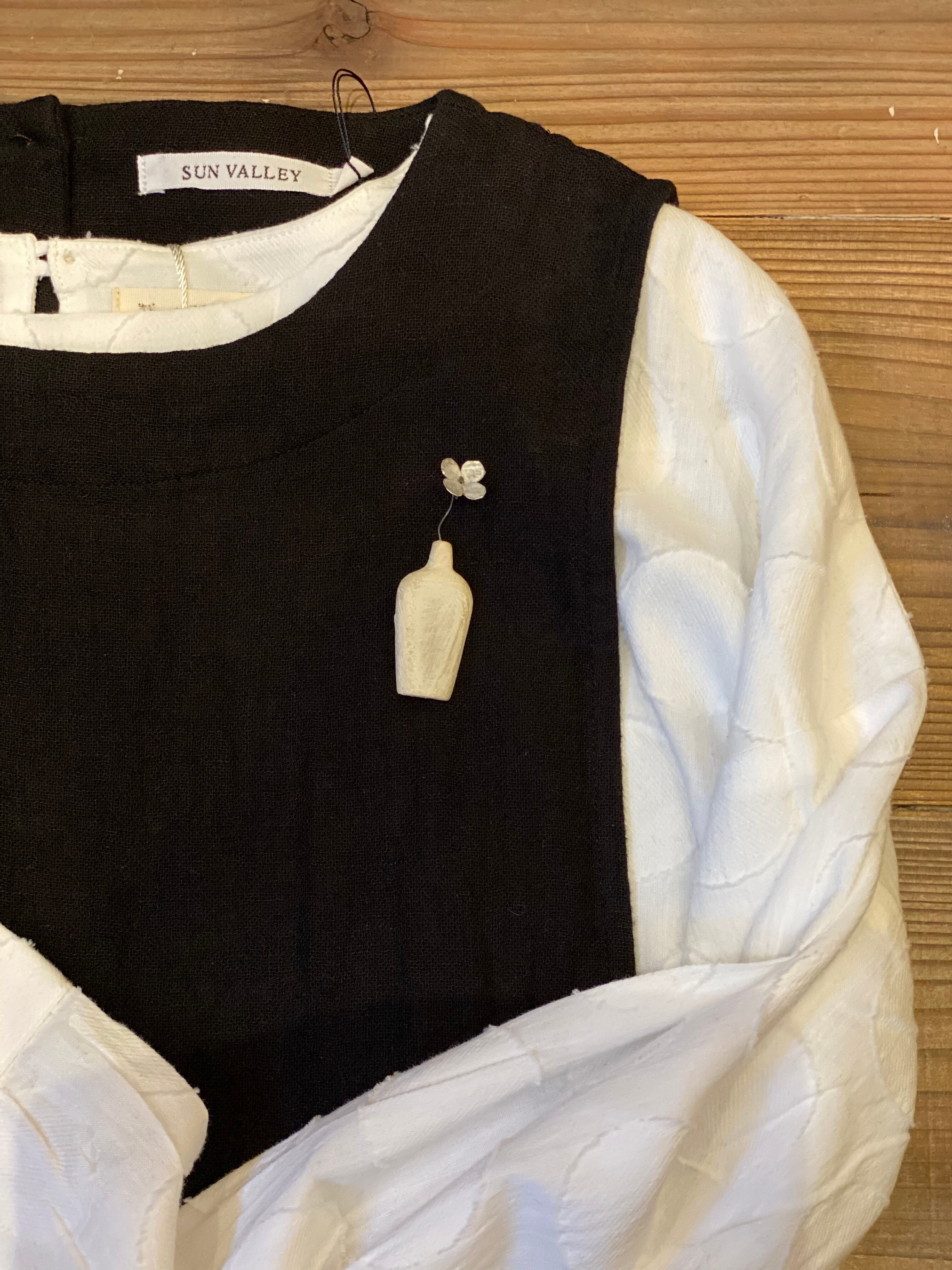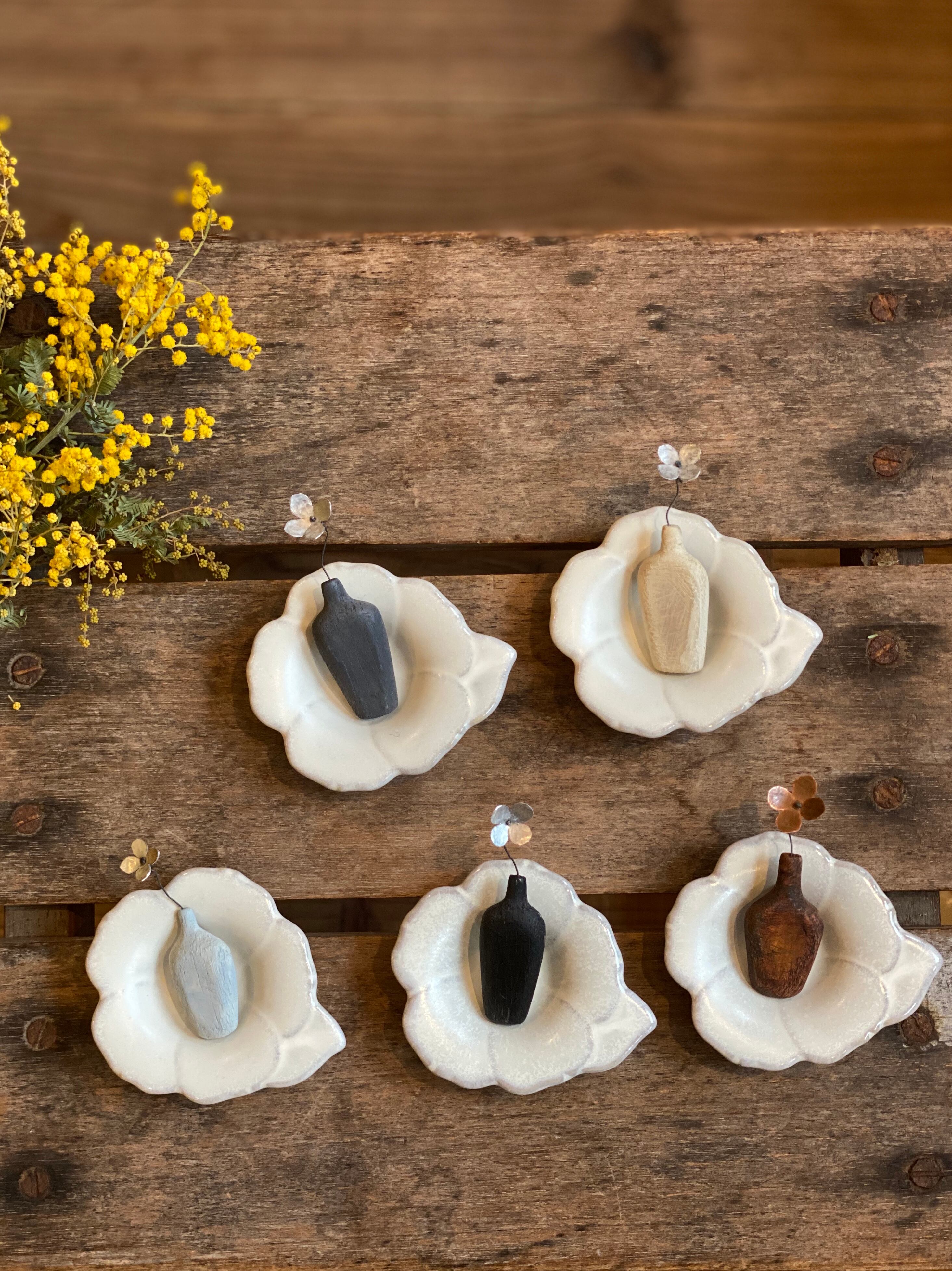 ブランド モイズム 愛媛県 廃材アートブローチ アルミを切り叩きながら 小さな花びらに仕立て 木を小さなボトルに仕立て 一輪挿しのブローチです。 サイズはバラバラですが だいたい高さが7cmほどになります アルミのお花の色がシルバーと銅色になります。 アルミなので錆はしません。 軽いです。