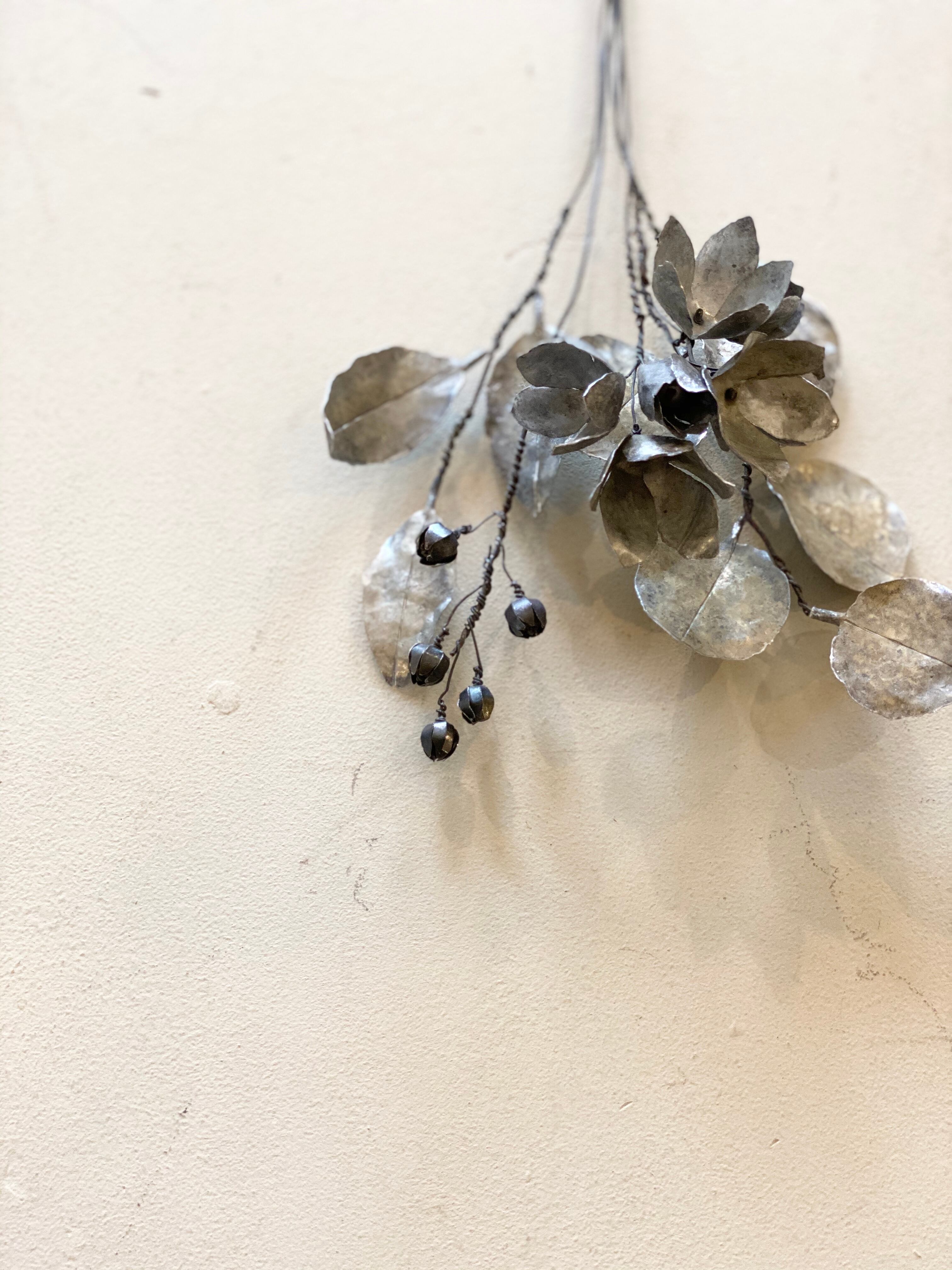 ブランド モイズム アルミや鉄を切ってたたいて曲げて作られた 廃材アートスワッグ 12cm×22cm ワイヤーにアルミの葉っぱと 鉄の花の実 かなり素敵です。