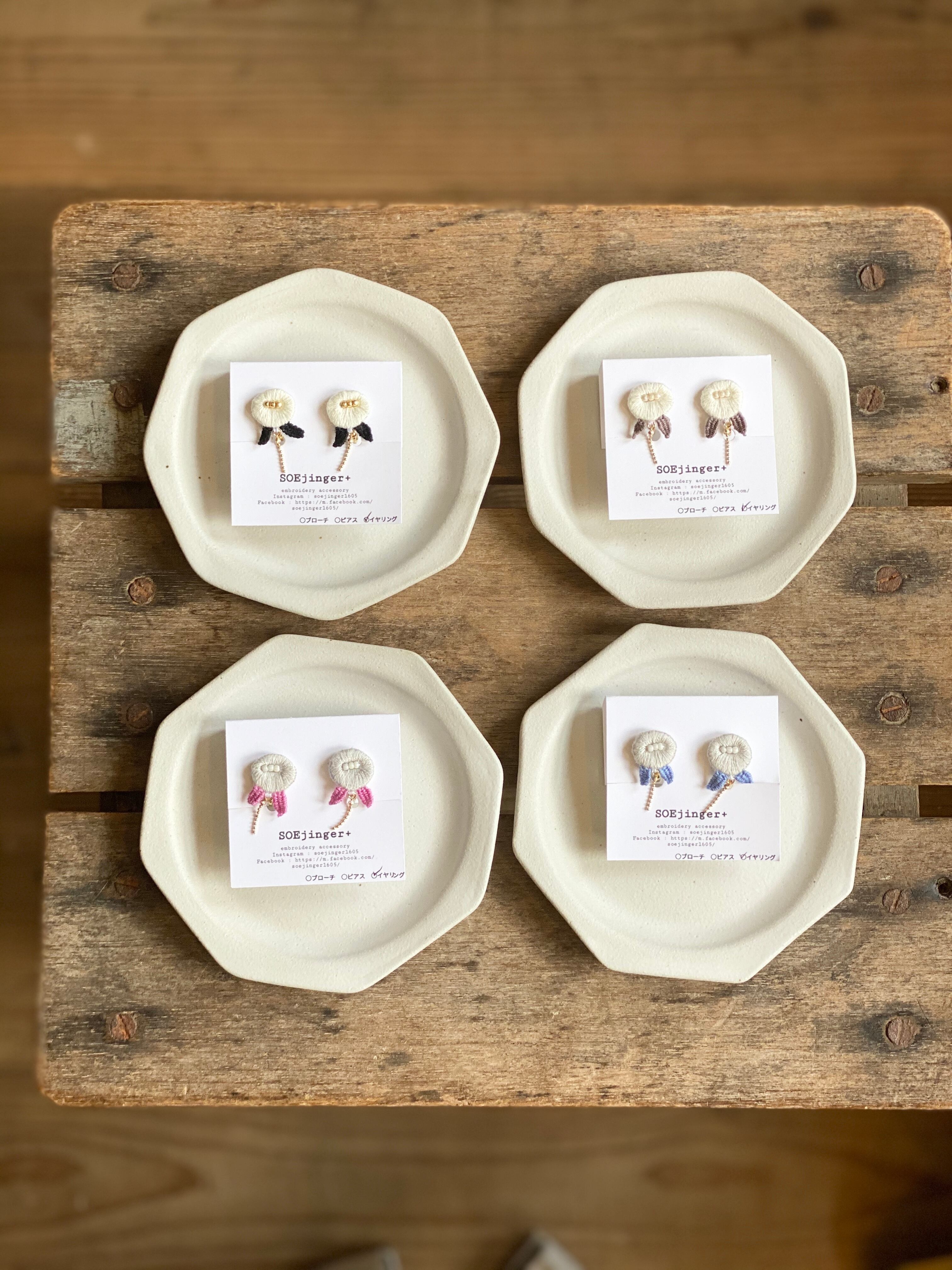 ブランド SOE jinger 手刺繍イヤリング ねじ式 花から垂れたビーズがゆらゆらとゆれ とても可愛いです。 1.5cm×3cm