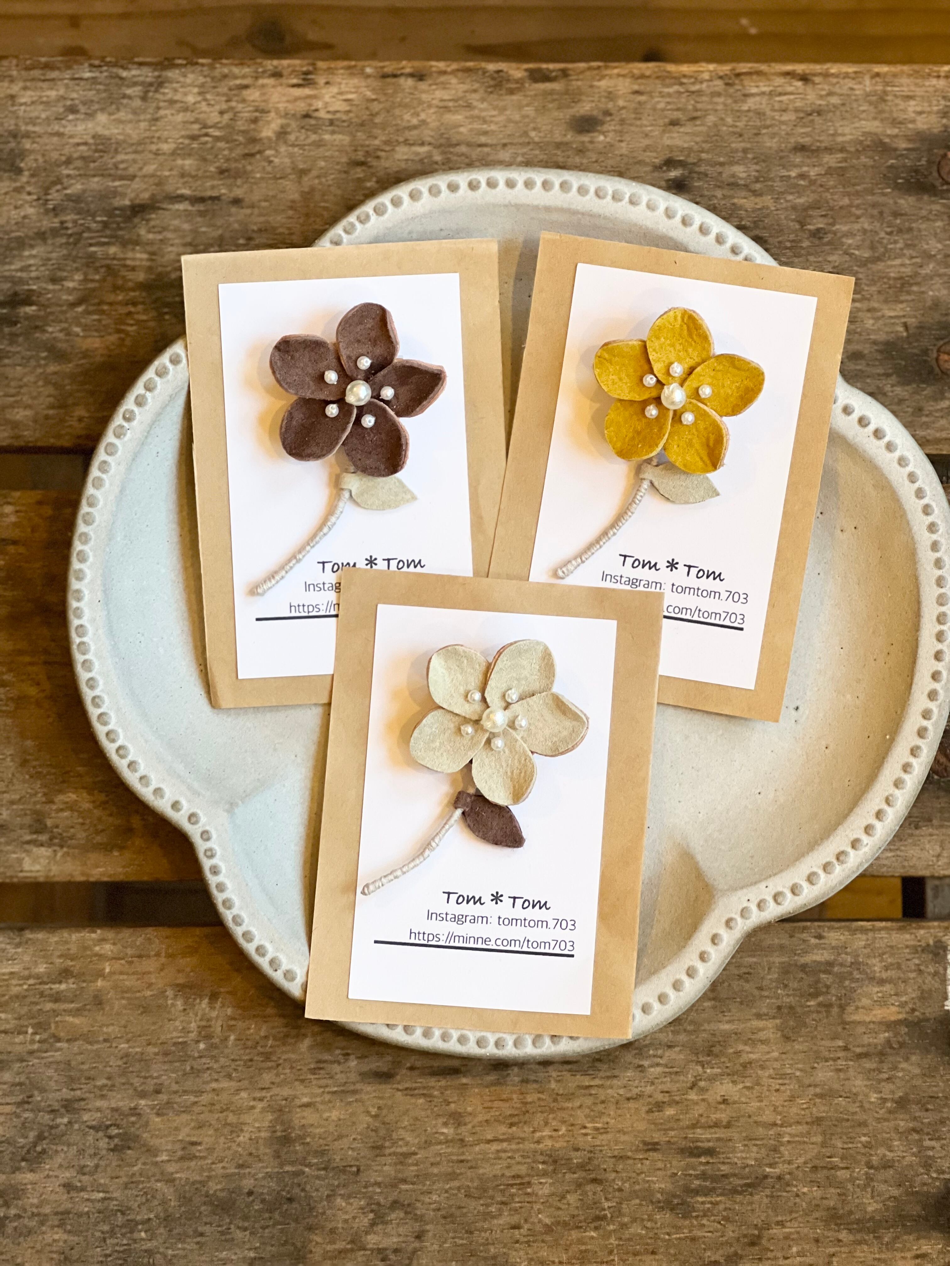 ブランド Tom Tom スエード革 ビーズ 茎はワイヤーに糸を巻いてます 花びらは裏に丸い革があり きちんとつけられているので しっかりしてます。 4cm×6.5cm