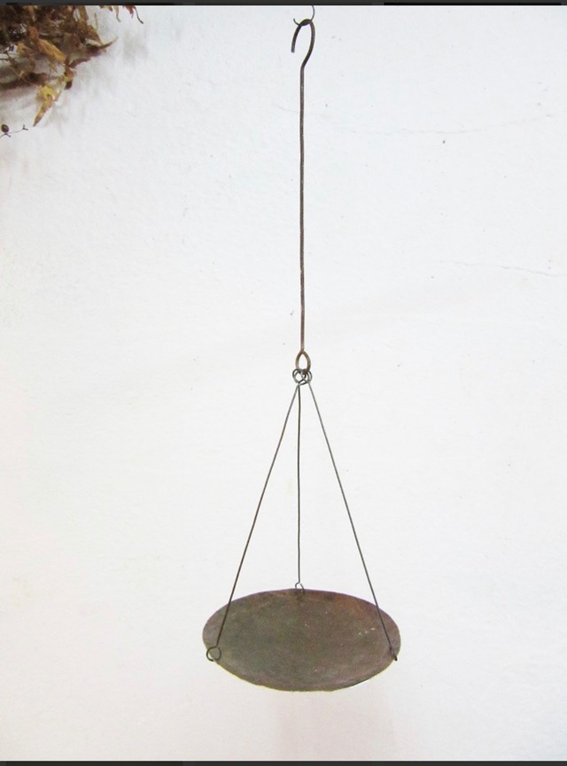 銅風金属板 丸小皿にして 古い針金で金具を作って 吊るせるようにしました。 小皿の直径約9cm 全長約27cm