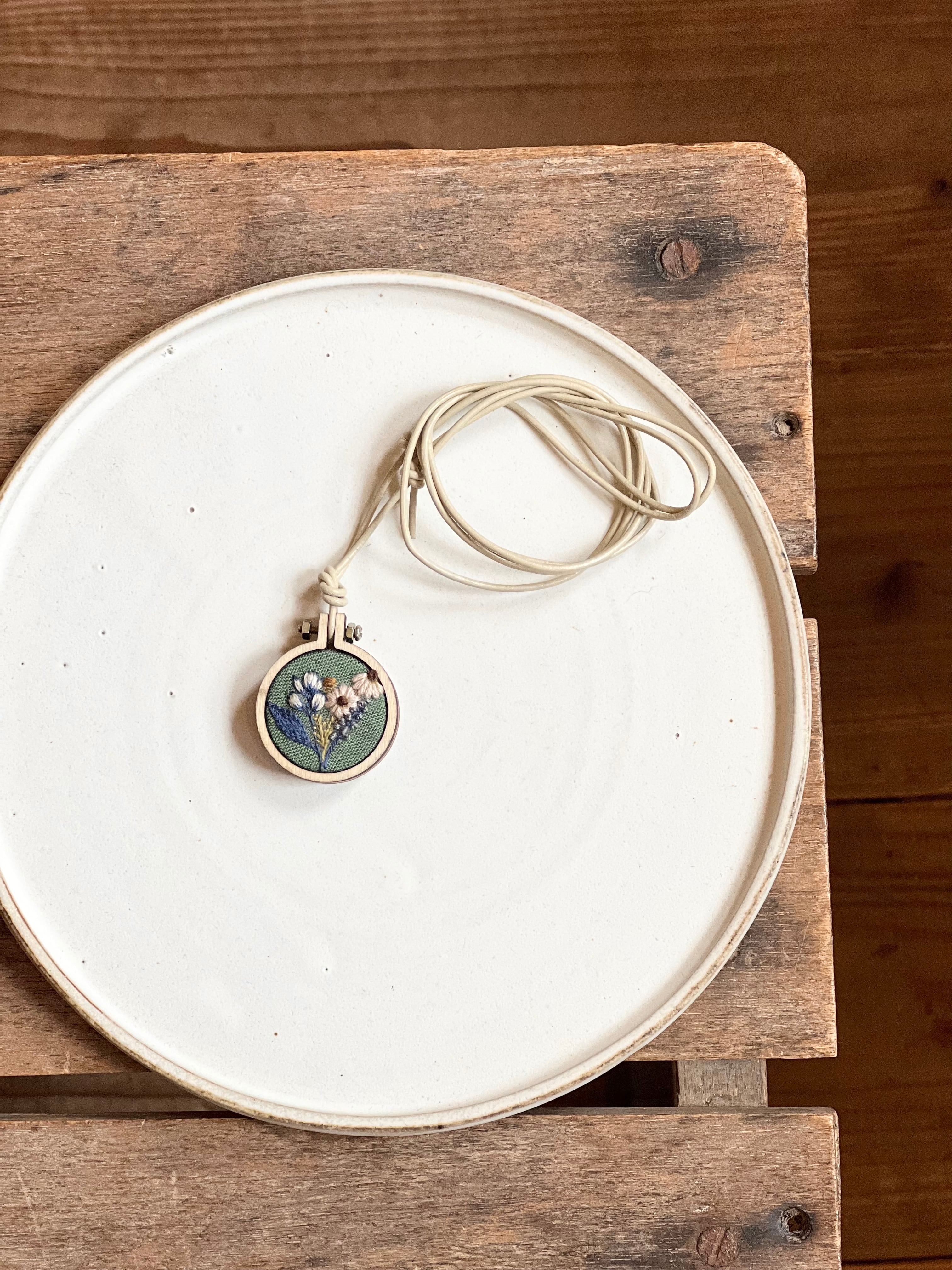 mutsumi ufuさんの素敵な刺繍図案のネックレスです。 とても細部まで綺麗になかなか見ない図案で 大人気です。 2.8cm×3.3cm 革紐 調整可能 こちらは丸タイプになります。