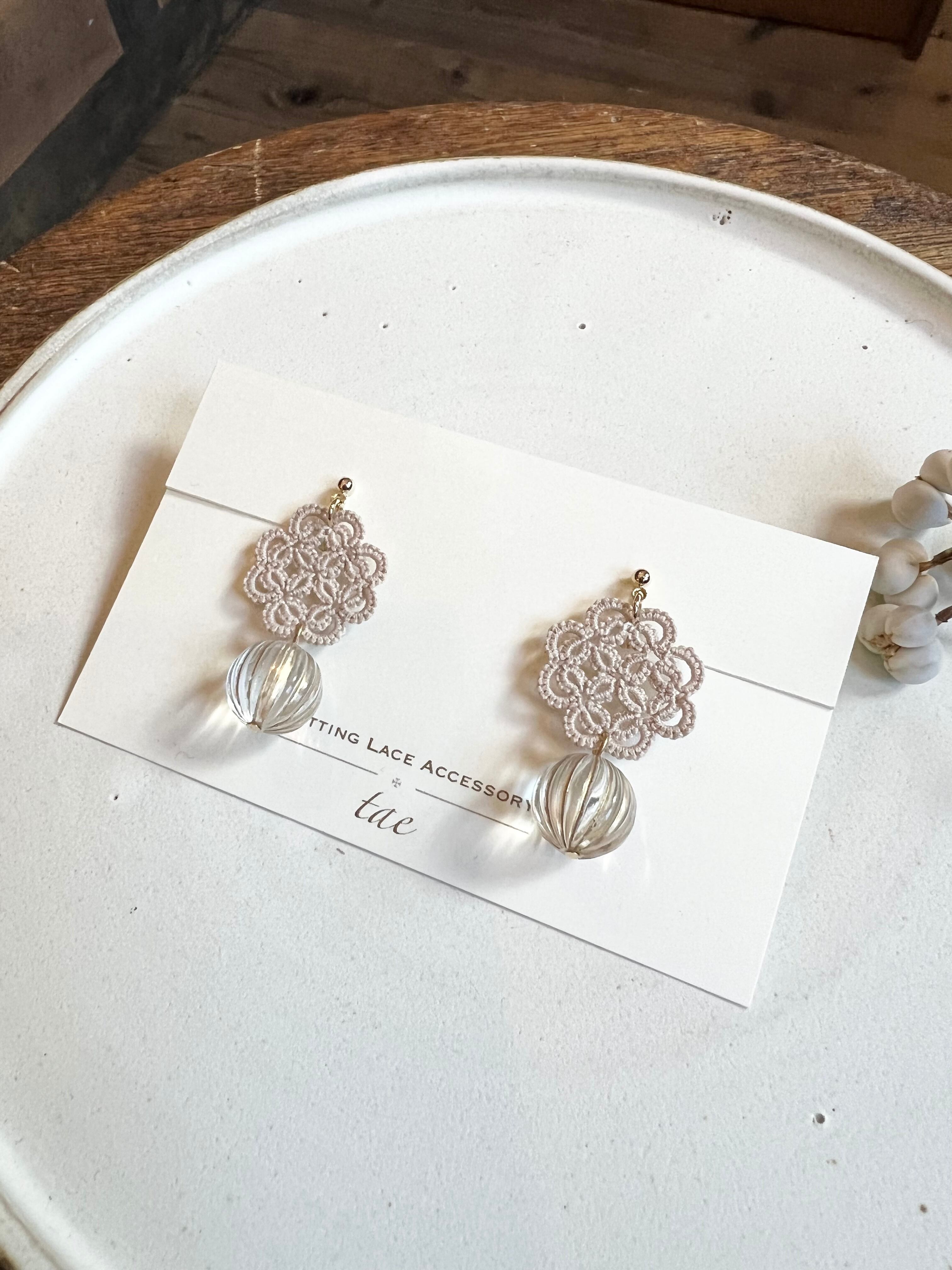 クロスモチーフにドイツ製のアクリルビーズを合わせました。 【材質】 綿レース糸・アクリルビーズ イヤリング(真鍮・樹脂カバー付き)ねじ式 その他金具(真鍮) 2cm×3cm