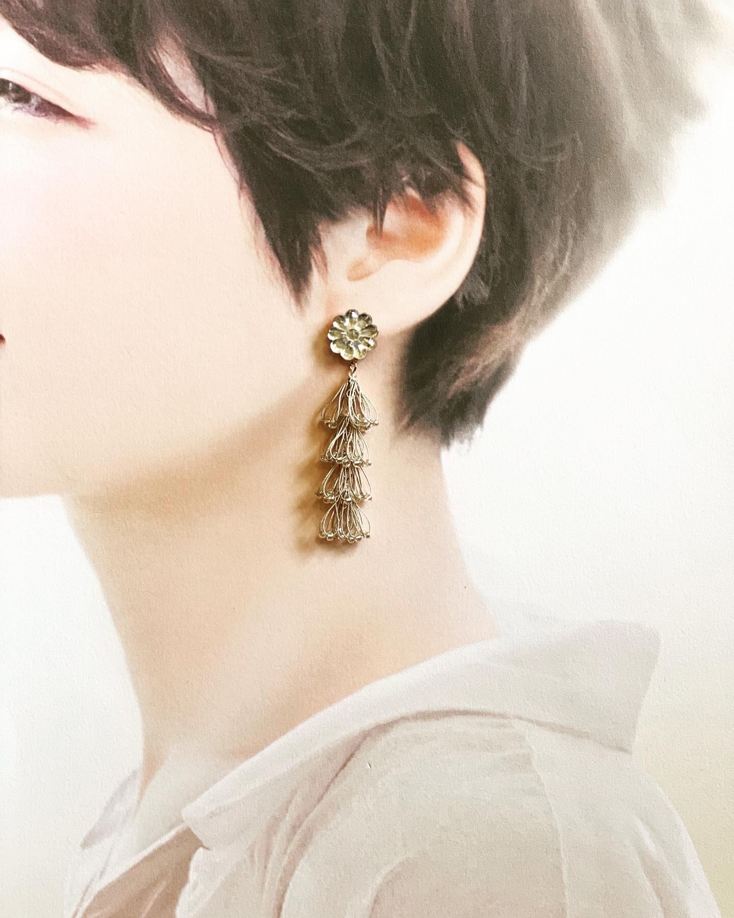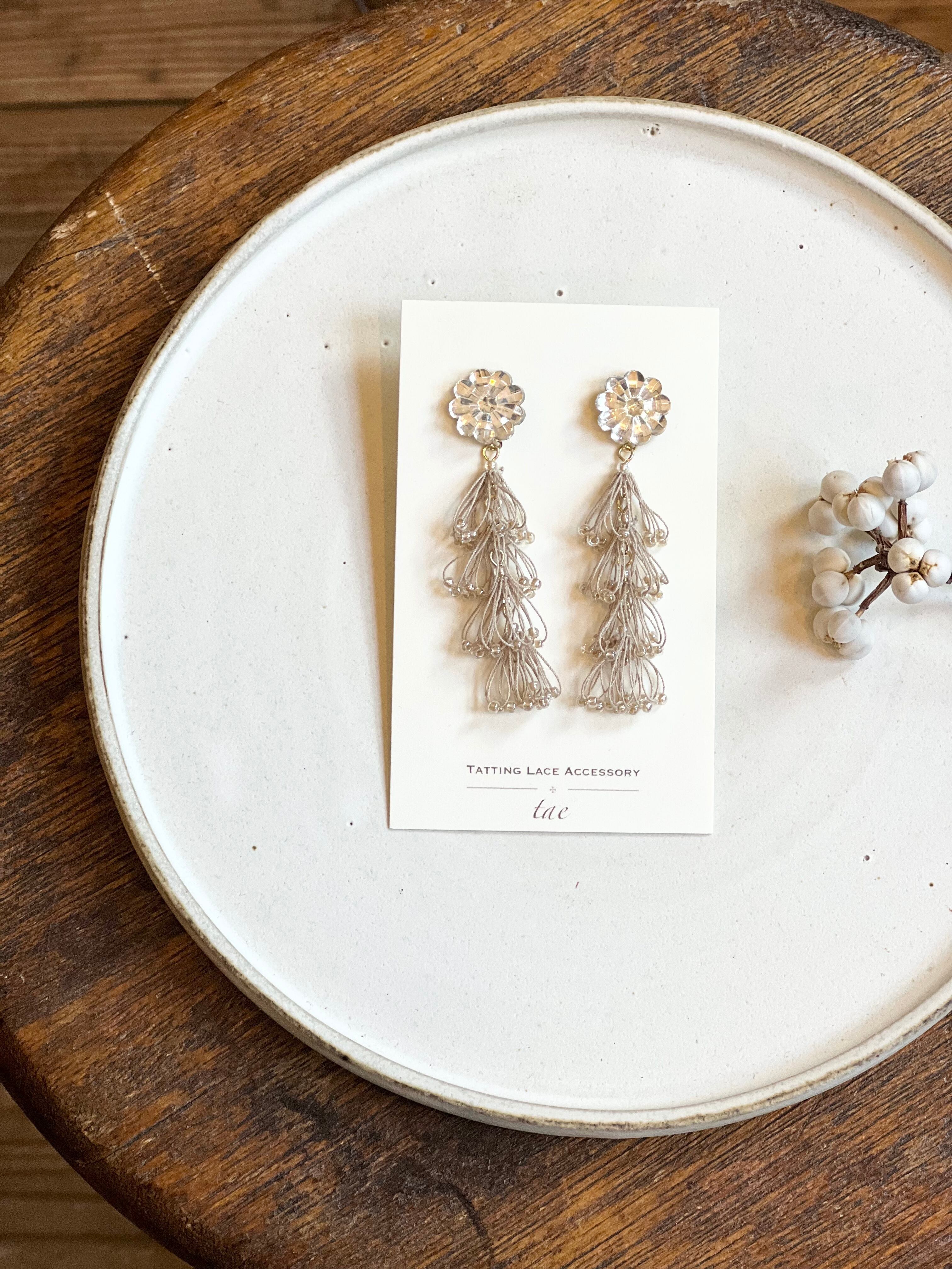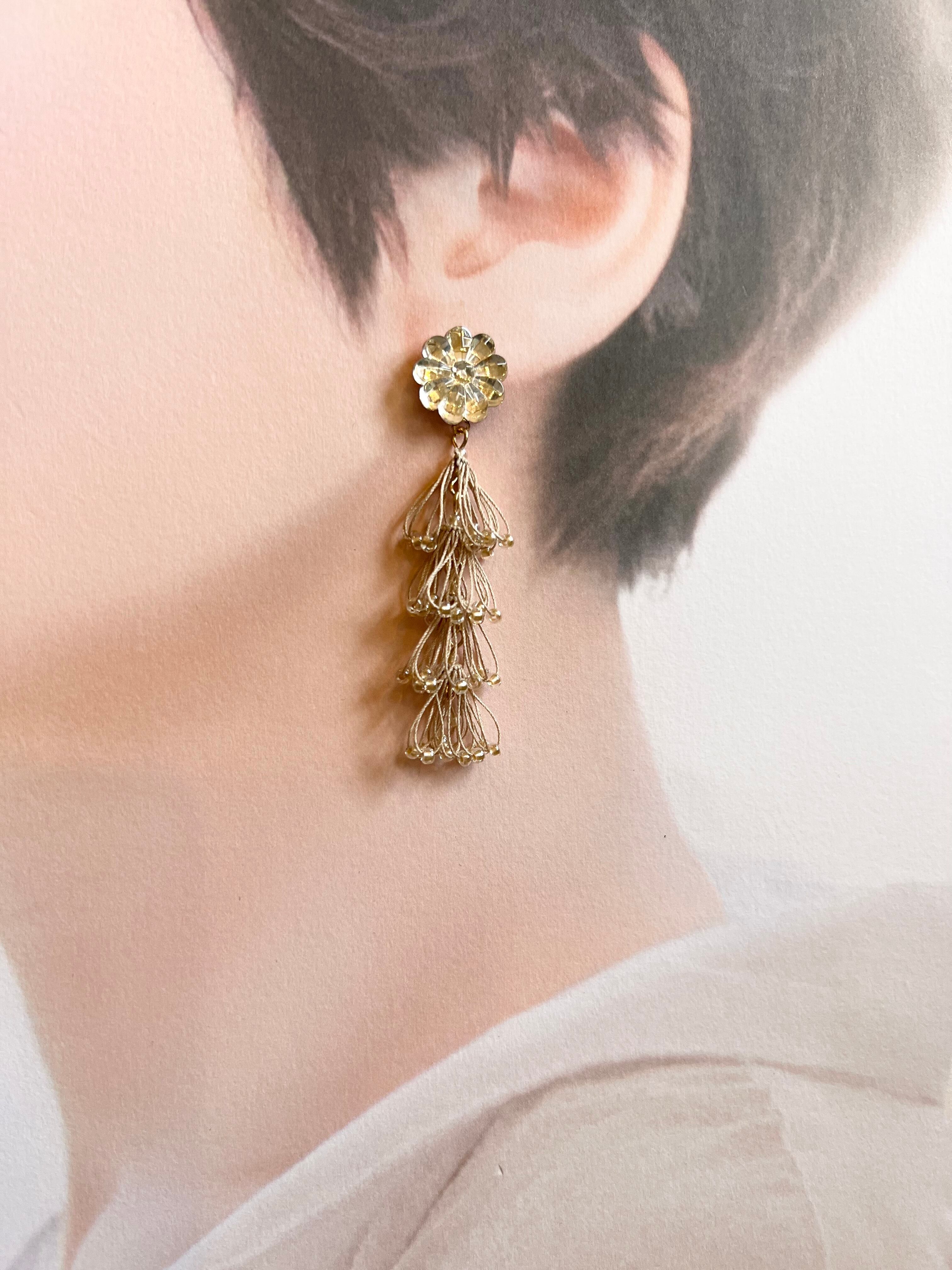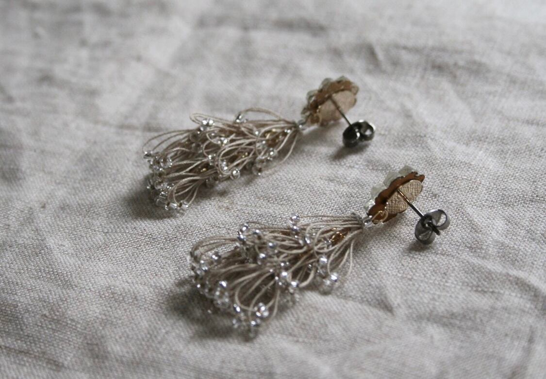 丸い花の形のガラスカボション(ドイツヴィンテージ)と、ベージュの糸にガラズビーズを通したタッセルを合わせました。