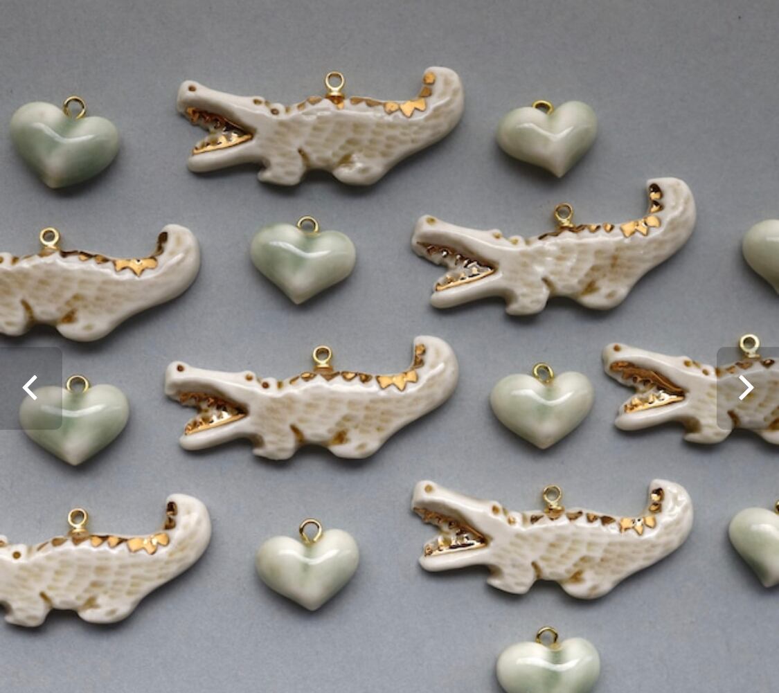 陶器でできたピアスです。わにとハートがモチーフのぷらぷら揺れるタイプのピアスです。