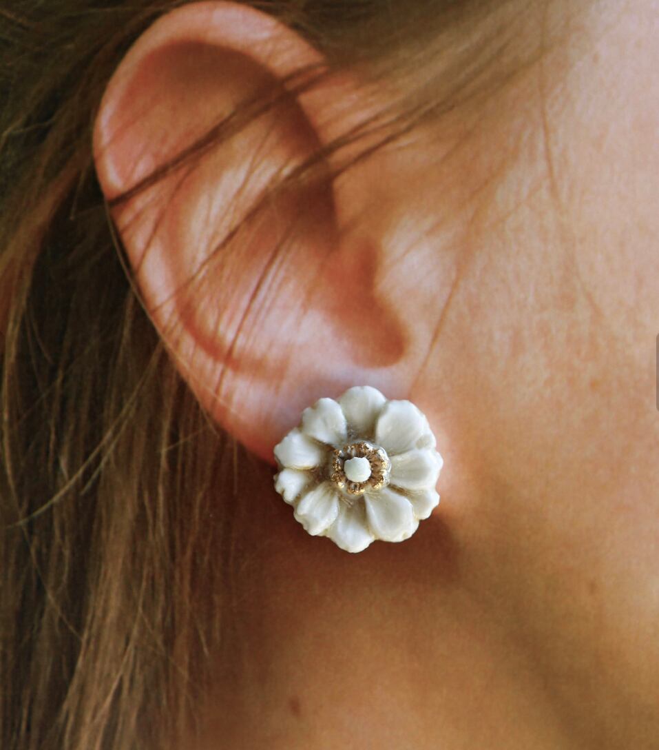 ポピー ピアス 材質 陶器 ピアス サージカルステンレス 大きさ:縦2.0㎝ 横2.2㎝(陶器部分のサイズ) 重さ :1.9g (片方) ポピーの花の陶器のアクセサリーです。 薄く繊細な花びらは手で一つ一つ作られています。磁器ならではの白い艶やかな質感です。花の中心部はオリーブ色。そのまわりのおしべは金彩が施されています。 お花の中心は金彩が施されています。