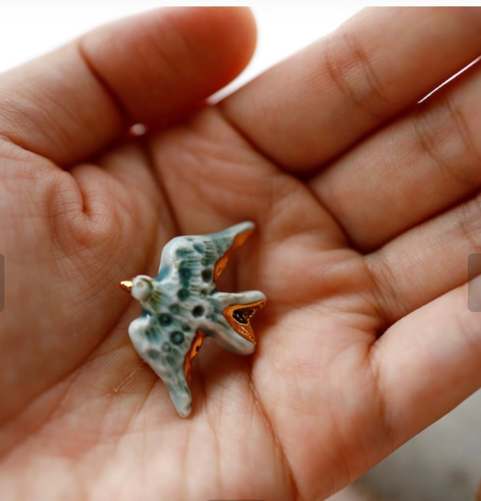 小さなつばめ ブローチ 材質 陶器 真鍮 大きさ:縦㎝3.5 横2.5 ㎝(大きさ重さは一つずつ若干異なります) 重さ :3.6g 箱入りです 小さいツバメの陶器のブローチです。 細かい顔の表情は手で彫られてつくられています。 浅葱色の透明感のある釉薬がたっぷりかかています。