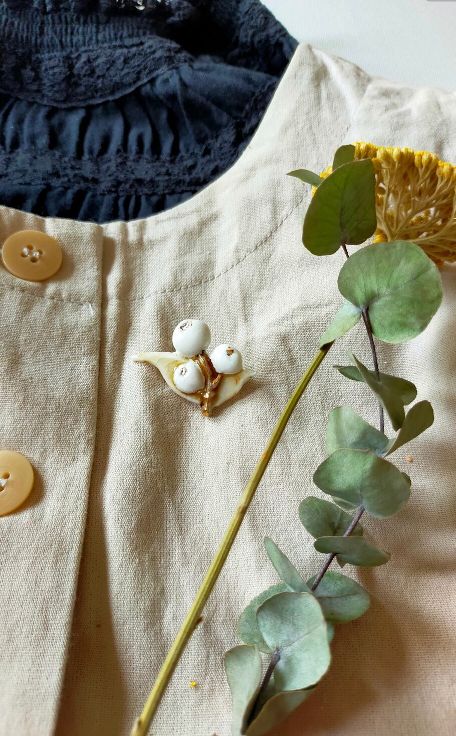 白い実 陶器のブローチ 材質 陶器 真鍮 大きさ:縦3.0㎝ 横 2.8㎝(大きさ重さは一つずつ若干異なります) 重さ :4.3g 箱入りです 真っ白なつややかな白い実のブローチです。 葉には透明感のある釉薬が、実にはしろいもったりとした釉薬が使われています