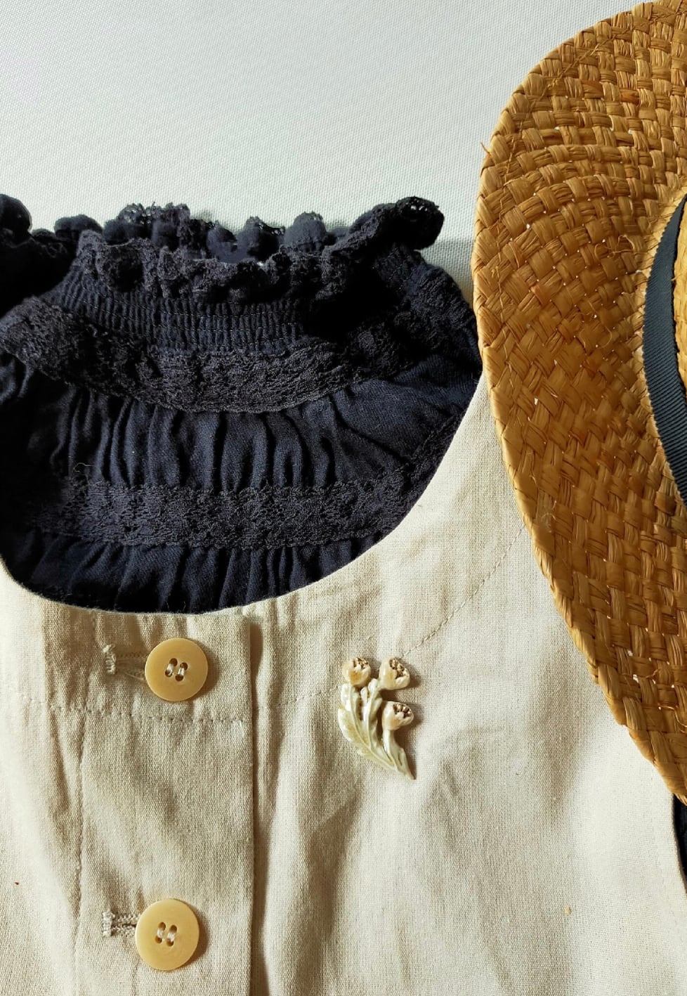 すずなりのはな 陶器のブローチ 三輪の小さなお花が咲いた陶器のブローチです。 全体に落ち着いた色合いになっています。おしべの部分に金がつけられていて日差しを受けてキラリと光ります。 材質 陶器 真鍮 大きさ:縦4㎝ 横 2.2㎝(大きさ重さは一つずつ若干異ります) 重さ :4.3g 箱入り