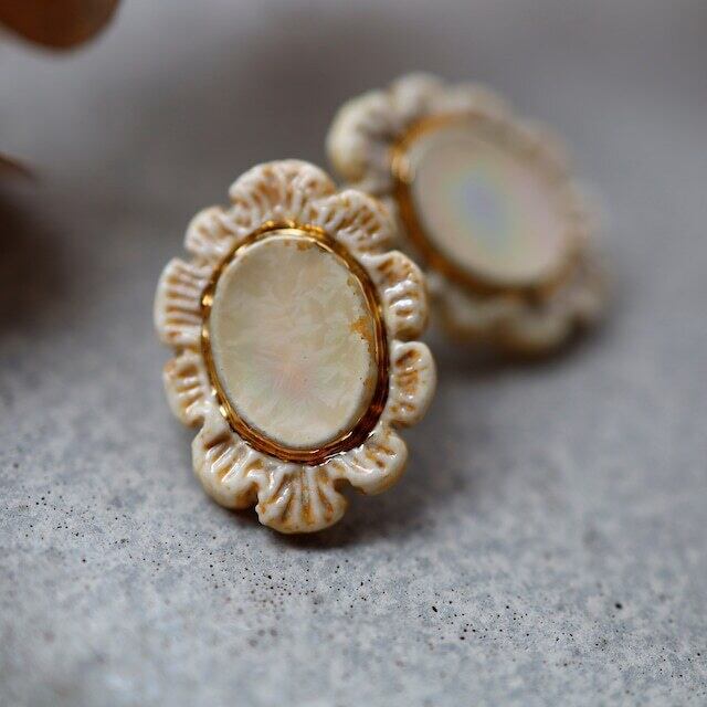 オーバル 真珠 ピアス 材質 陶器 ステンレス 大きさ:縦2.3㎝ 横1.8㎝(陶器部分のサイズ) 重さ :2.5g (片方) 大き目のオーバル型の陶器のピアスです。 どこか懐かしいアンティークな雰囲気。 真珠のような光沢がみられるオパールラスター釉を使用しています。この光沢は窯の中でできるもようなのでひとつひとつ違った表情が見られます。