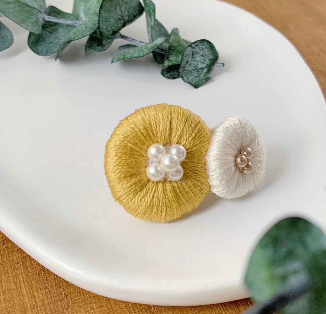 大きいお花にはラベンダーのようなパープルの刺繍糸とナチュラルホワイトの樹脂パール、小さいお花にはくすみホワイトの刺繍糸とベージュカラーの樹脂パールを使用しています。