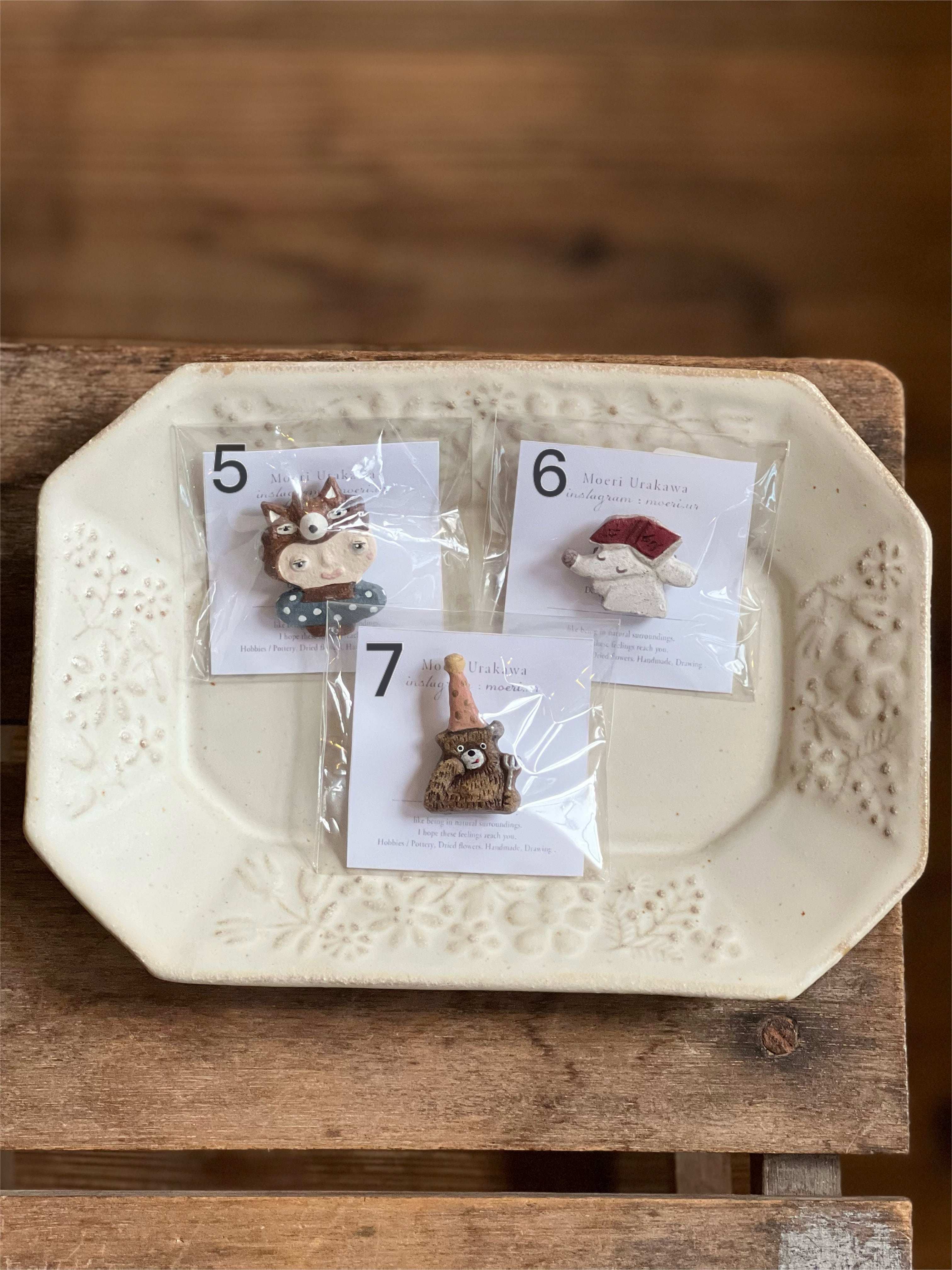 ブランド moeri 陶土ブローチ 何とも言えないお顔 着ぐるみタイプ 可愛いブローチです 一つ一つ 彫り焼き色をつけ 丁寧に作られてます 2.5cm〜3.5cm