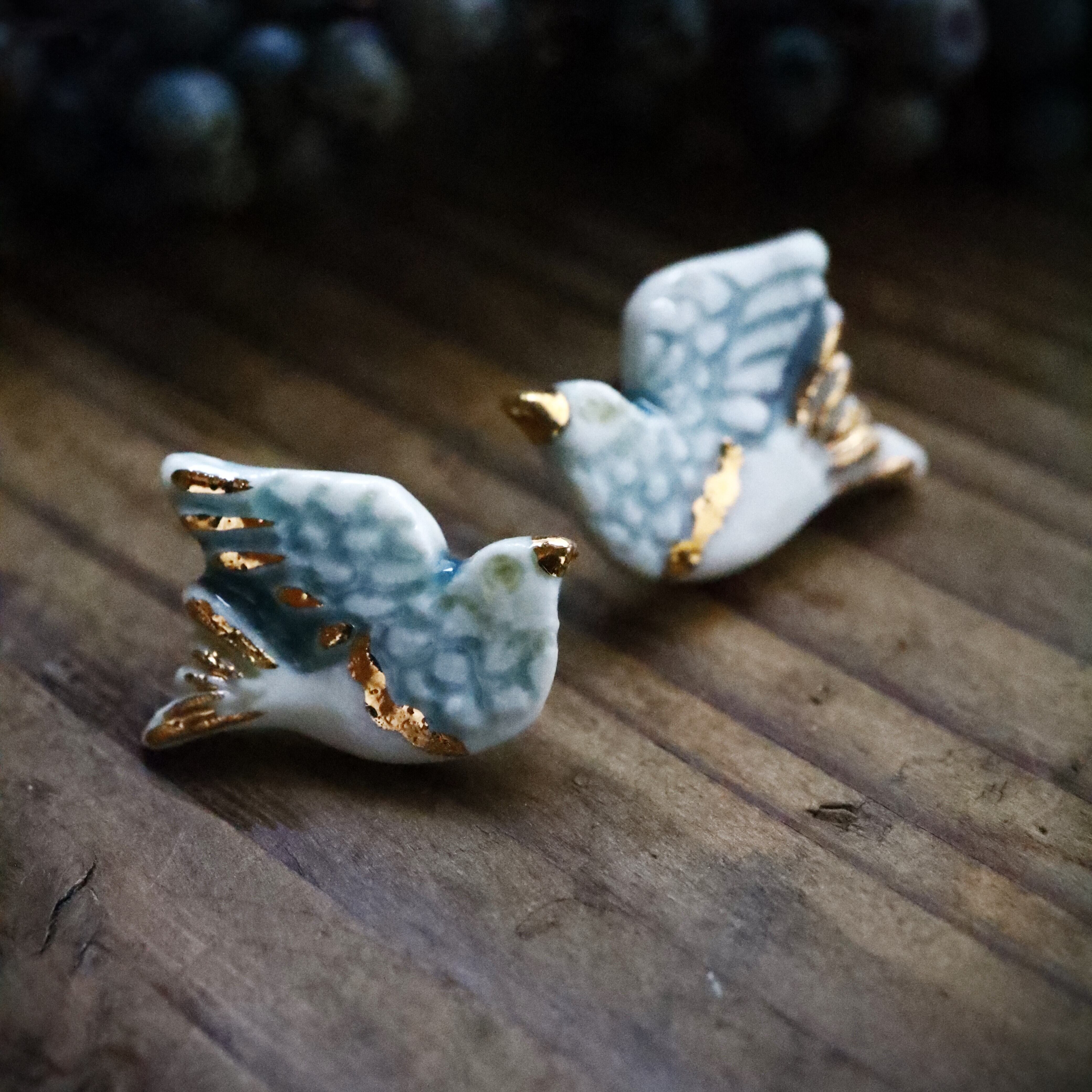 青いとり ピアス ねじ式イヤリング 材質 :陶器 金具 サージカルステンレス 大きさ:縦2.0㎝ 横 2.5㎝ (片方) 重さ :2.2g 幸せの青いとりのピアスです。羽の模様が細かく彫られていて、凹部には釉薬が濃くたまっています。うすい水灰色と金と白の組み合わせがとてもさわやかです。左右で違うデザインになっています。 画像より もう少しペパーミントです。