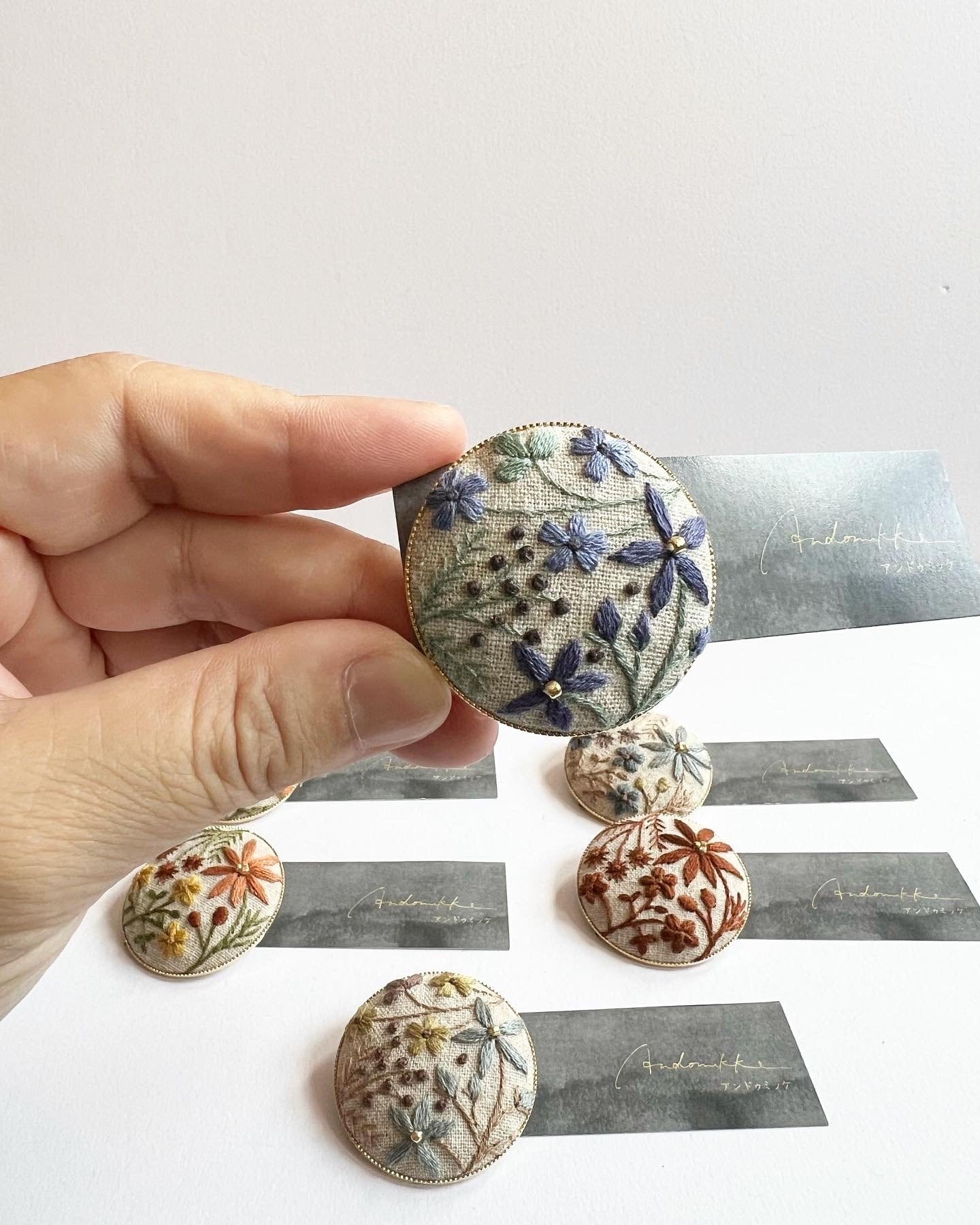 ブランド ANDOMIKE 手刺繍ブローチ 金属部分にカンがついてますので 紐を通してネックレスにもなります。 4.2cm