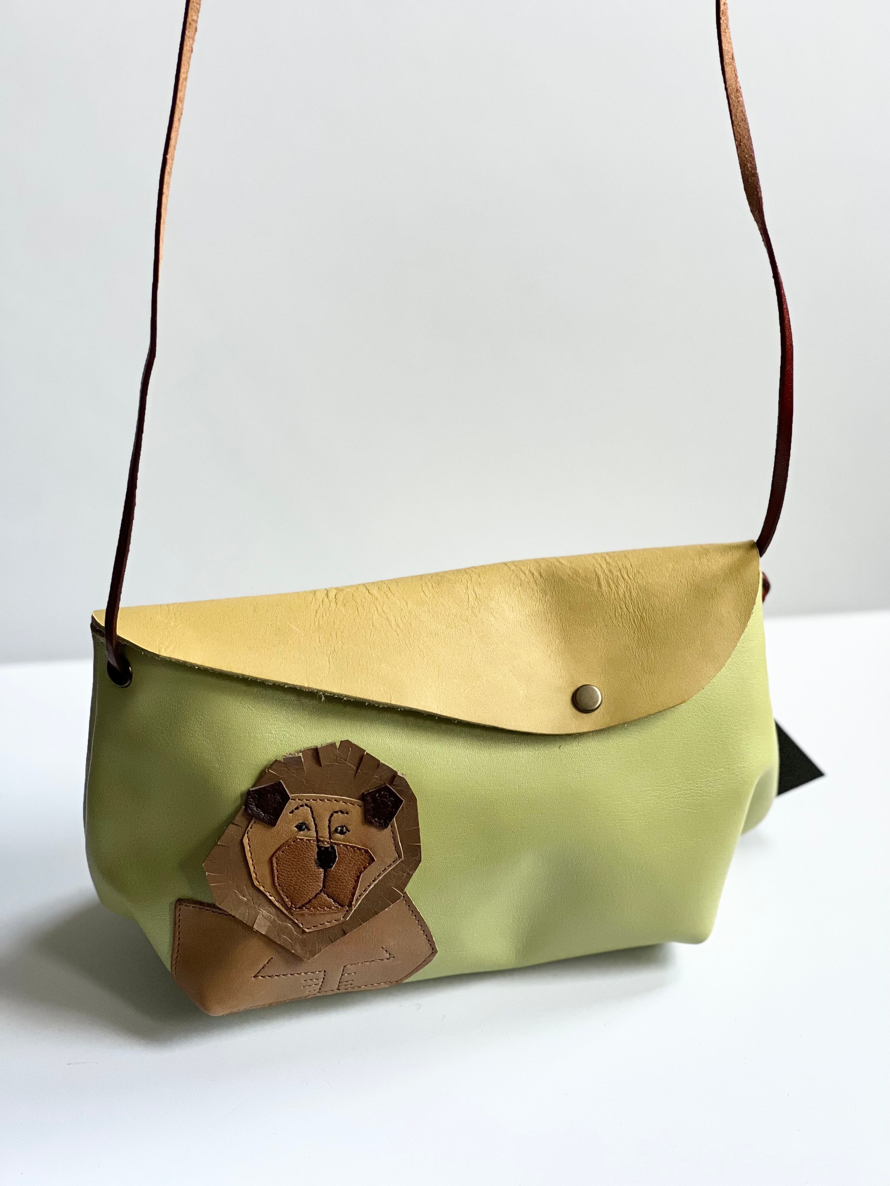 やや柔らかな艶なし黄緑革にライオンモチーフ