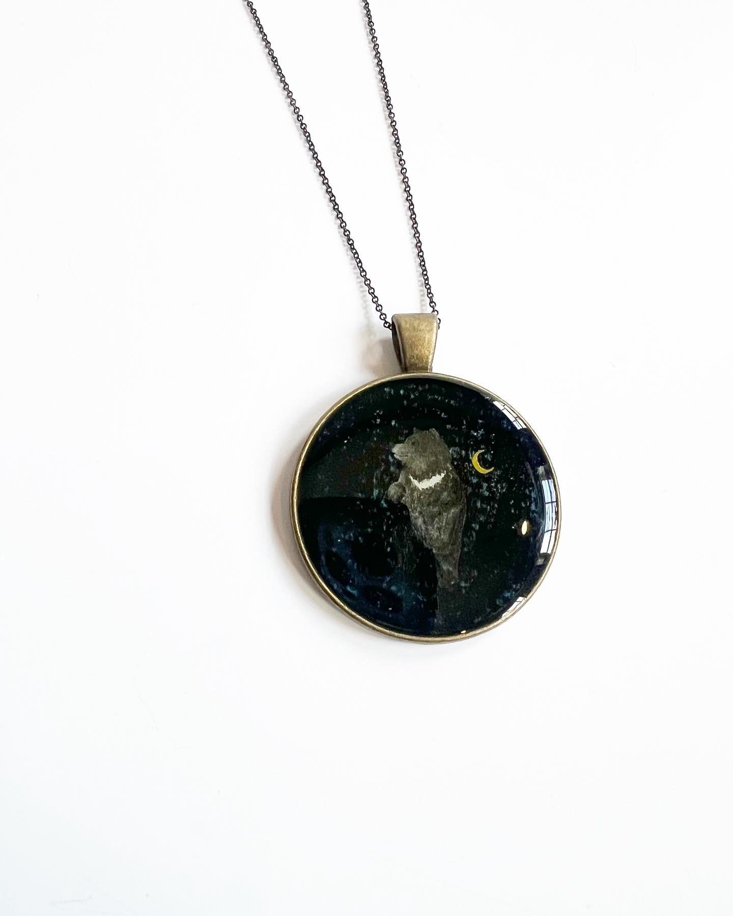 ブランド KARASKI オリジナルイラスト レジンコーティング くまさんと月 少し背景にラメが入ってますのでキラキラと綺麗です。 バックは濃紺です。 3.5cm ネックレスチェーン長さ44cm お好きな紐に変えて 長くもできます。 箱入りなのでプレゼントにも。