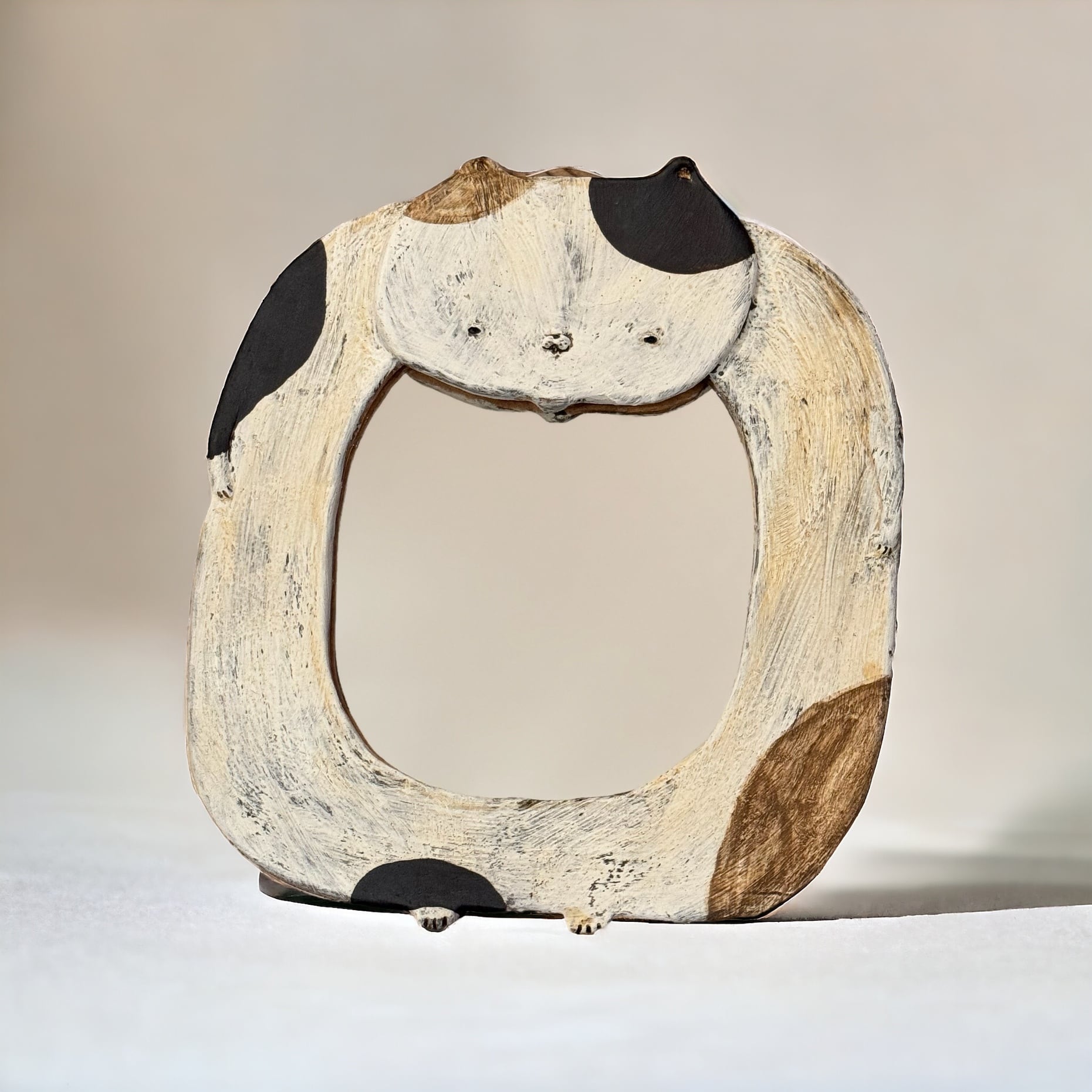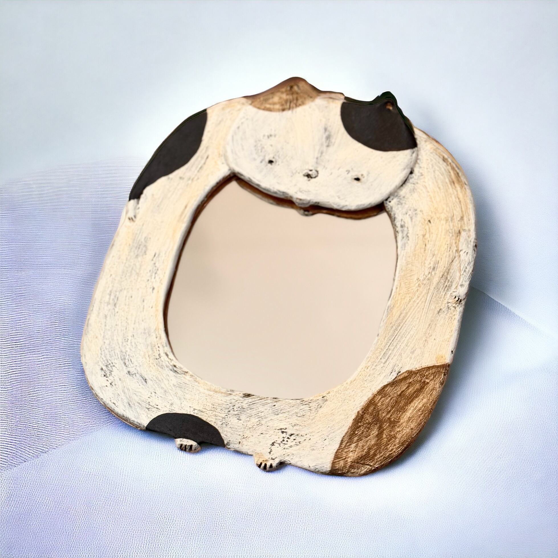 ブランド 黒田理恵 東京都在住 陶芸作家 なんとも可愛いねこの鏡 足や手がまた可愛い ワイヤーがありますので 壁掛けにもなります 横25cm 縦28cm