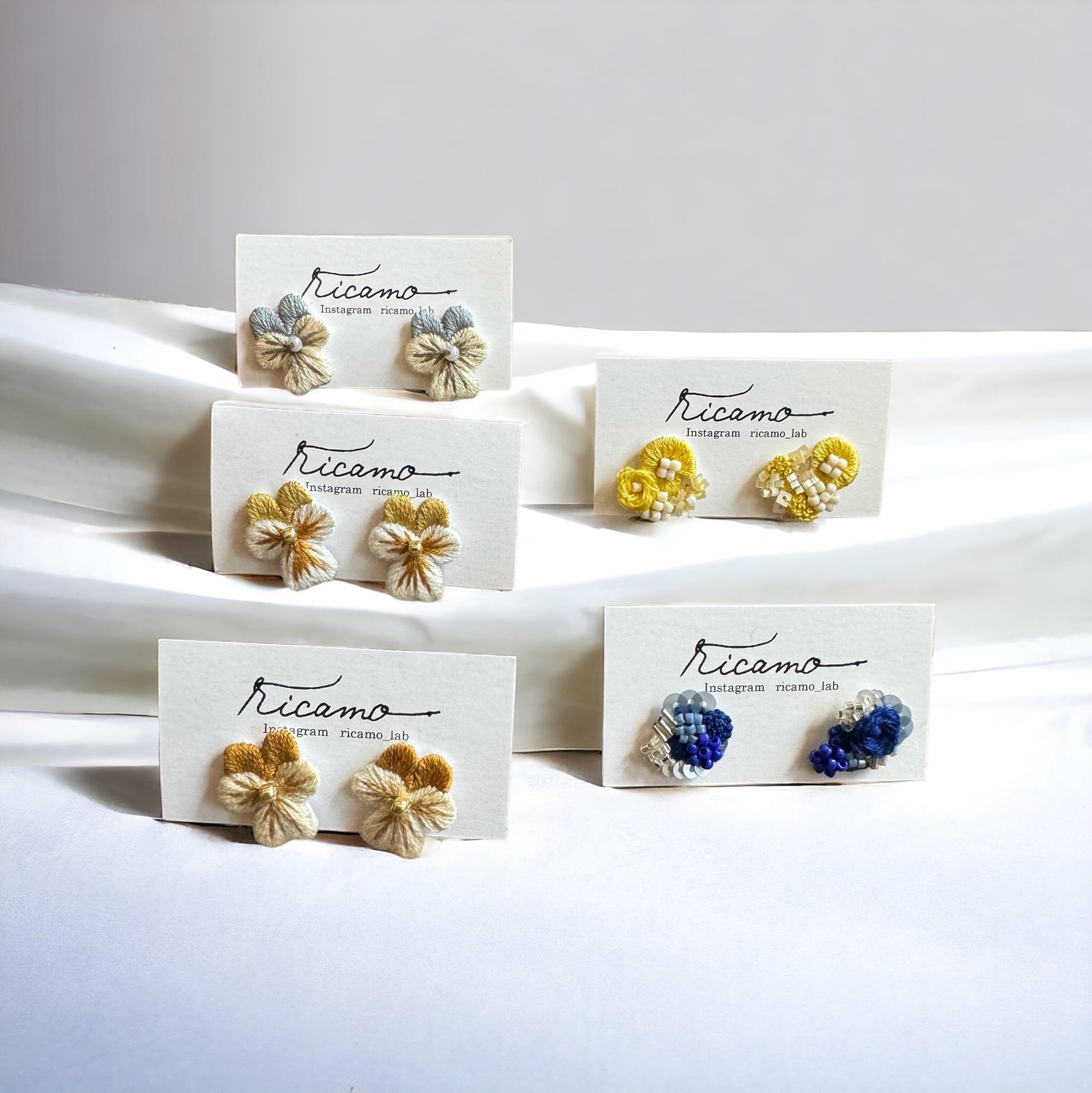 ブランド ricamo 手刺繍アクセサリー ポストピアス ねじ式イヤリング 約1.5cm〜2cm 糸とビーズね女性らしい可愛いアクセサリーです