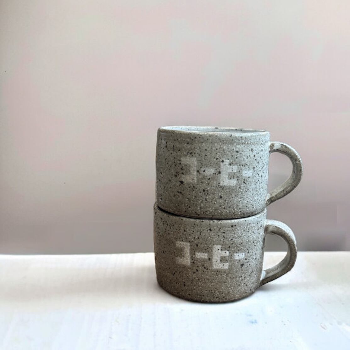 ブランド 森脇 要 クスッと笑えるシリーズ陶器 マグカップ 後ろと前は ひらがなとカタカナでちがいます 口径7.5cm 高さ7cm口径9cm 手持ち部分含む12cm 高さ6.5cm ハンドメイドなのでお色や文字が少しずつ違ってきます。 釉薬の具合でも違ってきます。 こちらで選んで発送させて頂きますので味と思って下さい。